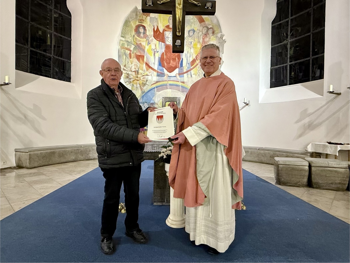Im Rahmen der sonntäglichen Messfeier überreichte Stadtpfarrer Frank Mathiowetz Dr. Helmut Rohde die Ehrennadel der Diözese Würzburg.