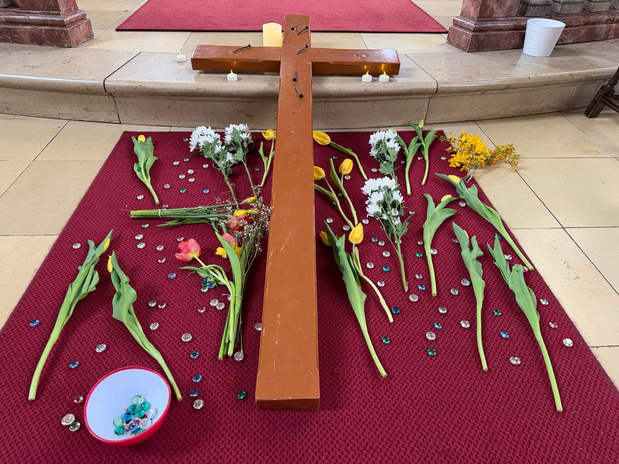 Nach dem gemeinsamen Kreuzweg folgten Fürbitten, bei denen für Kinder, Kranke, Streitende und Verstorbene gebetet wurde. In der anschließenden Kreuzverehrung konnten die Kinder und Erwachsenen symbolisch ihre Sorgen und ihren Dank vor das Kreuz bringen – dargestellt durch Steine für das Schwere und Blumen für das Schöne im Leben.