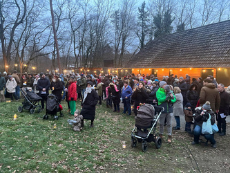 Ein großer Stern, den die Pfadfinder in eine Baumkrone gehängt hatten, wies den Besucherinnen und Besuchern den Weg. Zahlreiche Lichter tauchten den Platz in eine stimmungsvolle Atmosphäre. Besonders für die Kinder waren die Schafe eines Hörsteiner Schäfers ein Höhepunkt – gehören sie doch zu jeder Krippenszene dazu.