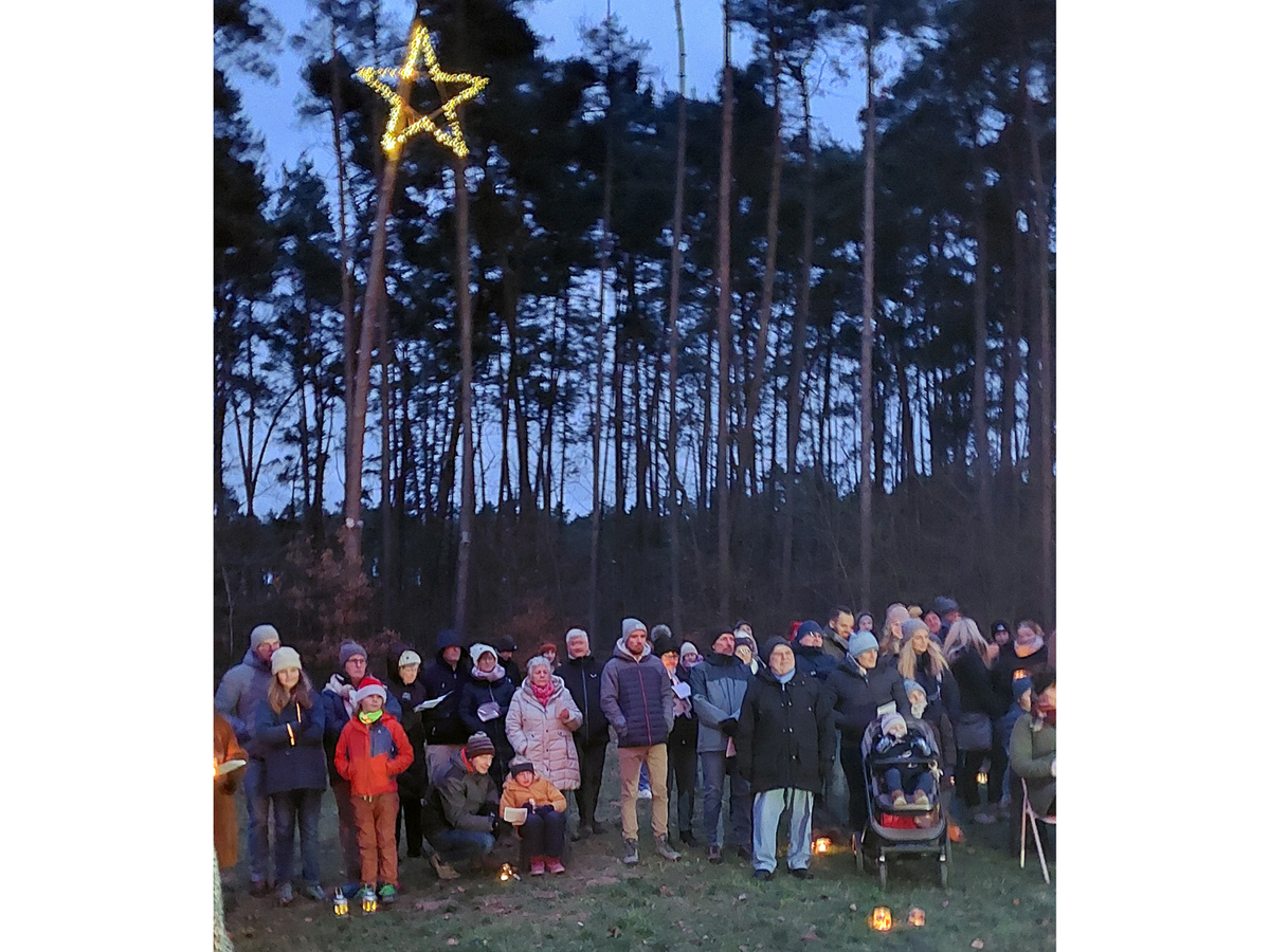 Unter dem Leitwort „Gott wird Mensch“ hatte das Vorbereitungsteam zahlreiche Impulse für die Wortgottesfeier zusammengestellt. Trotz eisiger Temperaturen gelang es der Musikgruppe, die Mitfeiernden zu begeistern. Den feierlichen Abschluss bildete das gemeinsame Singen von „Stille Nacht“ im Dunkel des Waldes.