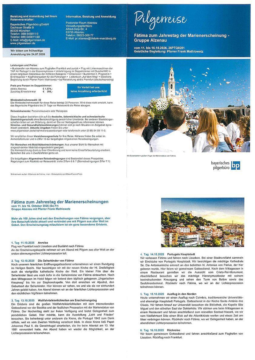 Der Pastorale Raum Alzenau lädt herzlich zur Pilgerreise nach Fátima ein. Vom 11. bis 16. Oktober 2026 haben Sie die Gelegenheit, einen der bedeutendsten Marienwallfahrtsorte der Welt zu besuchen und die Feierlichkeiten zum Jahrestag der Erscheinungen mitzuerleben. Die geistliche Begleitung übernimmt Pfarrer Frank Mathiowetz.