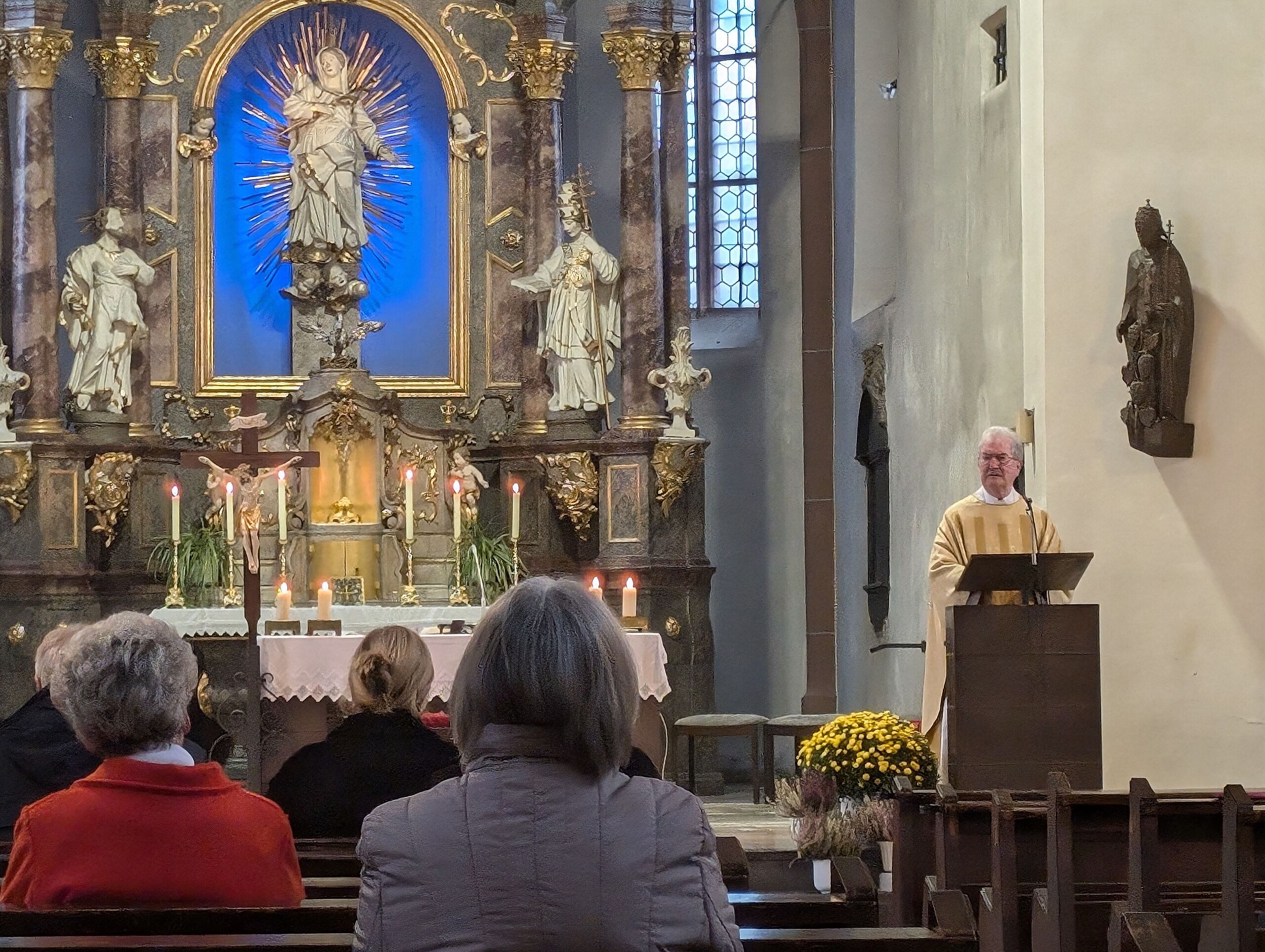 Am Feiertag und Hochfest Allerheiligen feierte Pfarrer im Ruhestand und Bischöflich-geistlicher Rat Rainer Durstewitz aus Maintal-Dörnigheim um 10:30 Uhr in der Pfarrkirche Maria Himmelfahrt ein Hochamt. In seiner Predigt bot er den Gläubigen theologischen Höchstgenuss in gut verständlichen Worten verpackt. Er stellte einen Artikel aus der theologischen Fachzeitschrift "Christ in der Gegenwart" vor. Dabei ging es um eine andere Sicht auf das Fest "Allerheiligen ". Sein Hauptausruf dabei war "Die Heiligen vom Sockel holen". Damit ist gemeint, dass diese auch Glaubenszweifel sowie innerliche und äußerliche Bedrängnis litten. "Das mache sie noch sympathischer" so der Bischöflich-geistliche Rat. Man dürfe sie nicht erhöhen sondern müsse sie ins Leben holen. In den Fürbitten und im Hochgebet schloss Durstewitz besonders die Verstorbenen mit ein. Nach dem Gottesdienst wurden Grablichter mit Hörsteiner Motiven angeboten. Um 17 Uhr fand die Andacht mit Gräbersegnung auf dem Hörsteiner Friedhof statt.