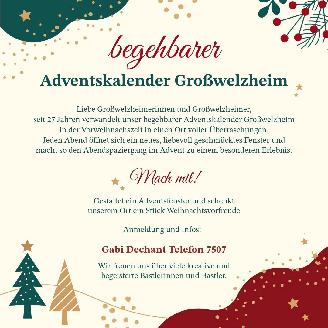 Seit über 27 Jahren verwandelt sich Großwelzheim in der Adventszeit in einen Ort voller Überraschungen. Unser begehbarer Adventskalender macht jeden Abend zu etwas Besonderem: Ein neues, liebevoll geschmücktes Fenster öffnet sich und lädt zu einem gemütlichen Spaziergang durch den festlich geschmückten Ort ein.