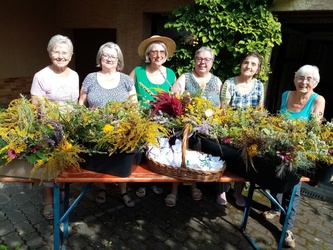 Auch in diesem Jahr pflegte der Frauenbund Dettingen wieder die alte Tradition Kräutersträußen für Maria Himmelfahrt zu binden. Die „Kräuterfrauen“ hatten zuhause ihre Gärten geplündert und trafen sich am Vortag des Festes bei Lotte Oster. Diese hatte bereits Tische gestellt, Bindedraht und sonstiges Zubehör bereitgelegt. Nun wurden die mitgebrachten Kräuter – Johanniskraut, Salbei, Dost, Pfefferminze, Lavendel, Goldrute, Schafgarbe, Großer Wiesenknopf, Rainfarn, Königskerze, Frauenmantel etc. - nach Gattung sortiert und danach zu kleinen Sträußchen gebunden. Der Duft der Kräuter war teilweise so stark, dass die Blumenbinderinnen ihre fröhlichen Gespräche aufgrund von Hustanfällen unterbrechen mussten. Aus dem mitgebrachten Material konnten 70 Kräutersträußchen hergestellt werden. Die beliebten Lavendelsäckchen, die ebenfalls an Maria Himmelfahrt gesegnet werden sollten, hatte Ida Trageser bereits zu Hause genäht.