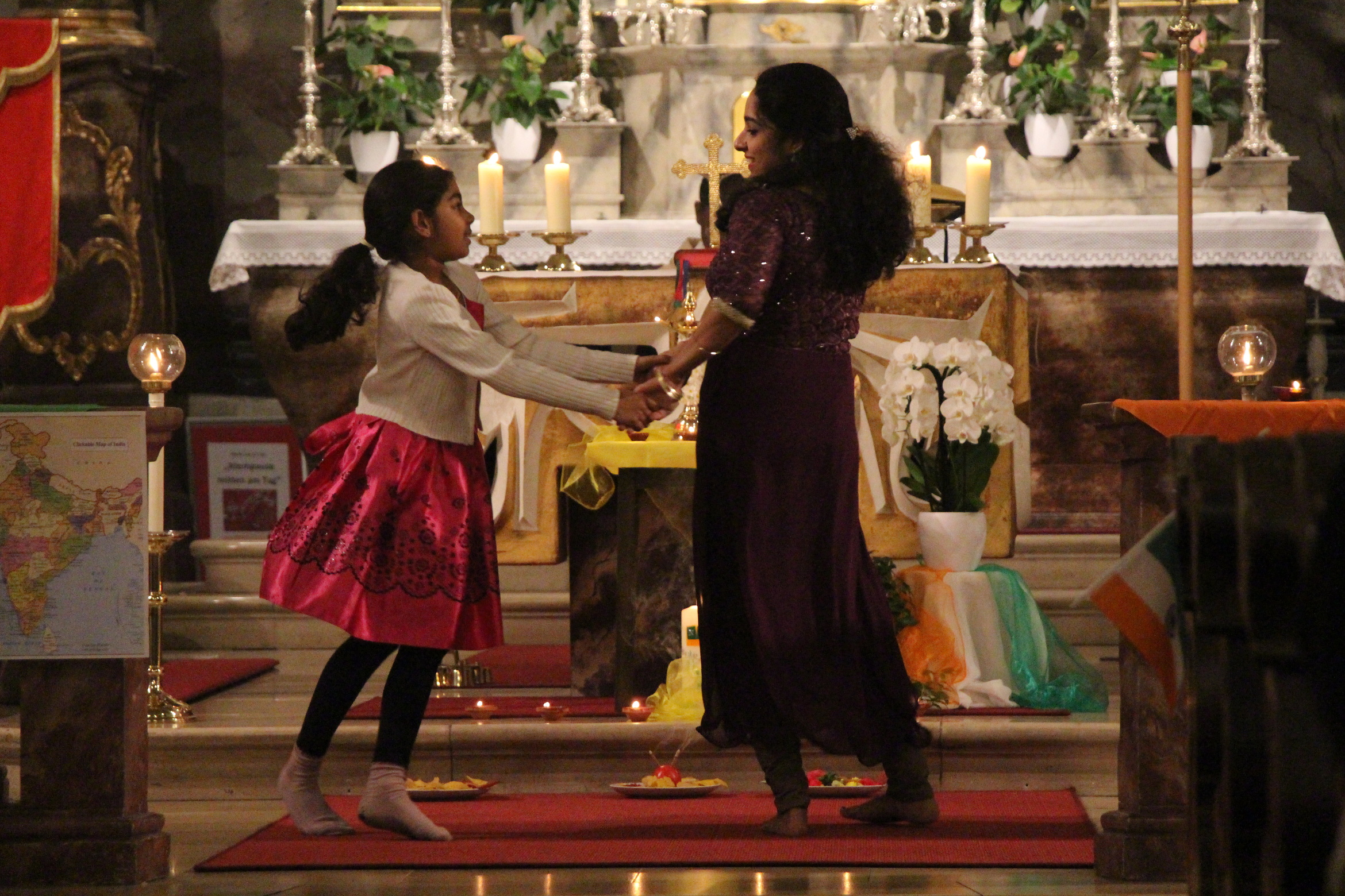Nach der Messe waren alle Gottesdienstbesucher ins Maximilian-Kolbe-Haus eingeladen, wo der Abend mit einem traditionellen Begrüßungstanz begann. Nach den Grußworten von Kaplan Napoleon und Pfarrer Frank Mathiowetz folgte ein informativer Kurzvortrag über die Kultur, Geschichte und Bedeutung der Region Tamil Nadu in Indien. Ein weiterer Tanz veranschaulichte die kulturelle Vielfalt Indiens.