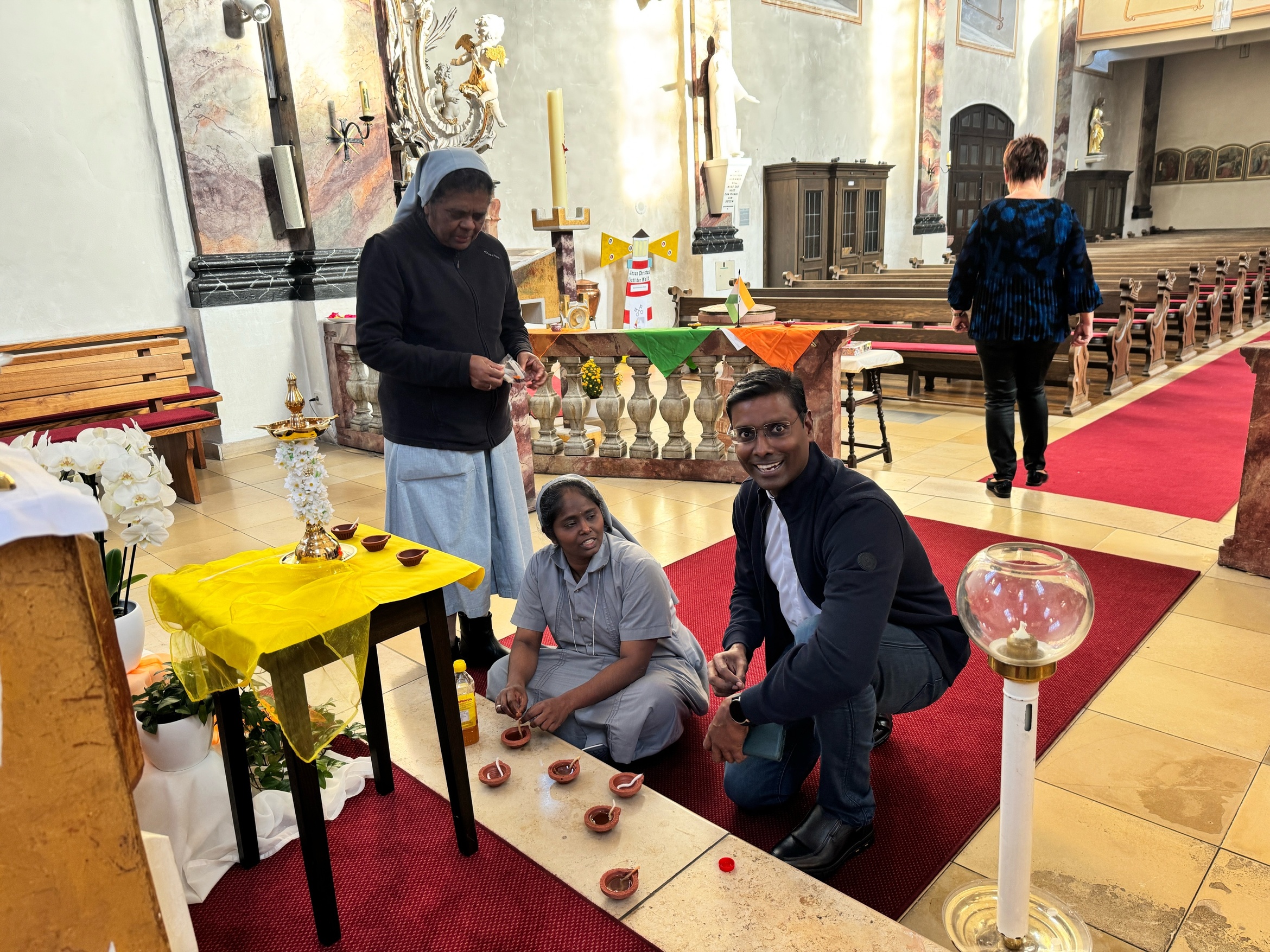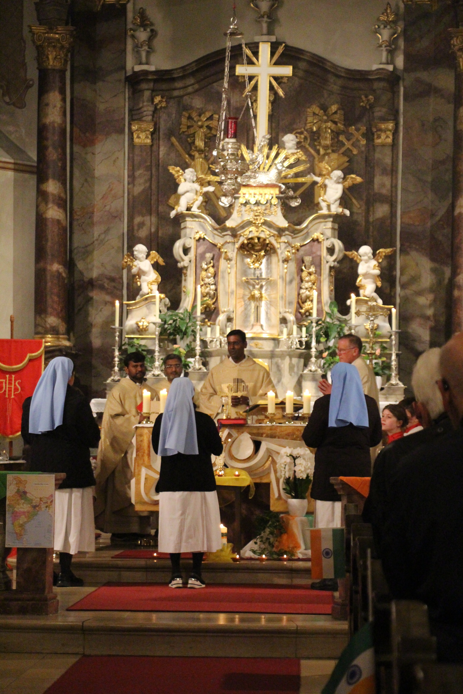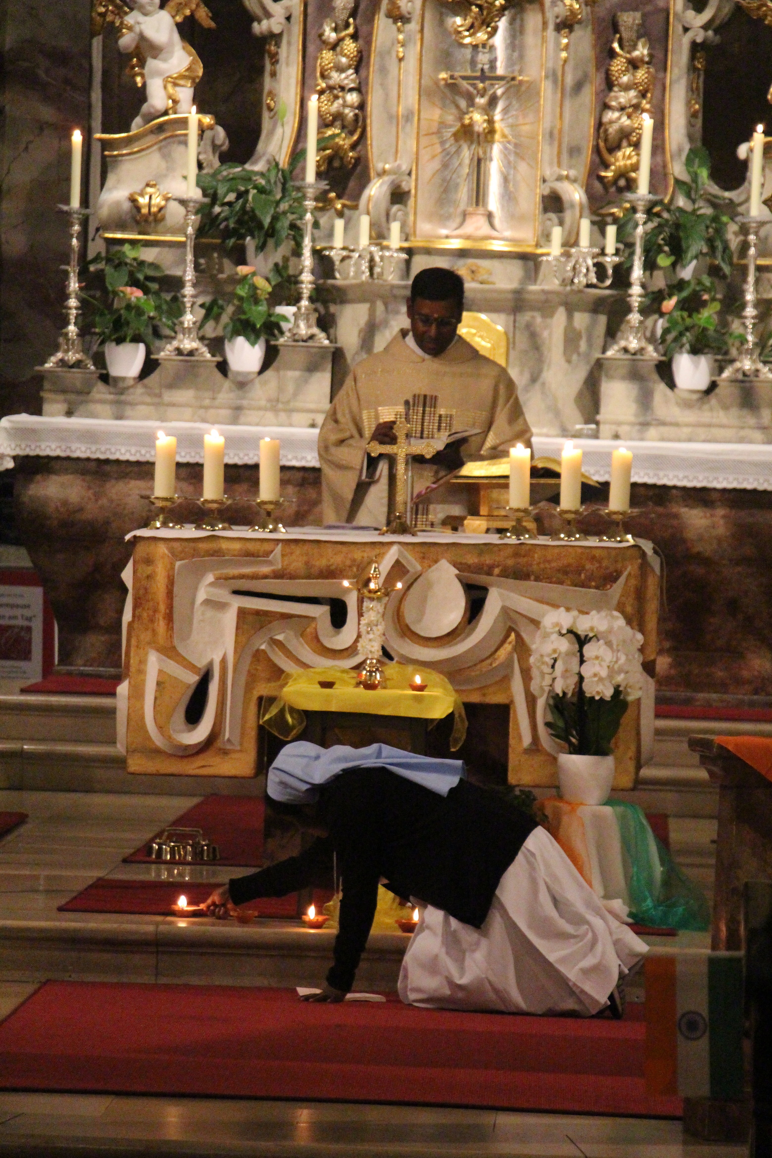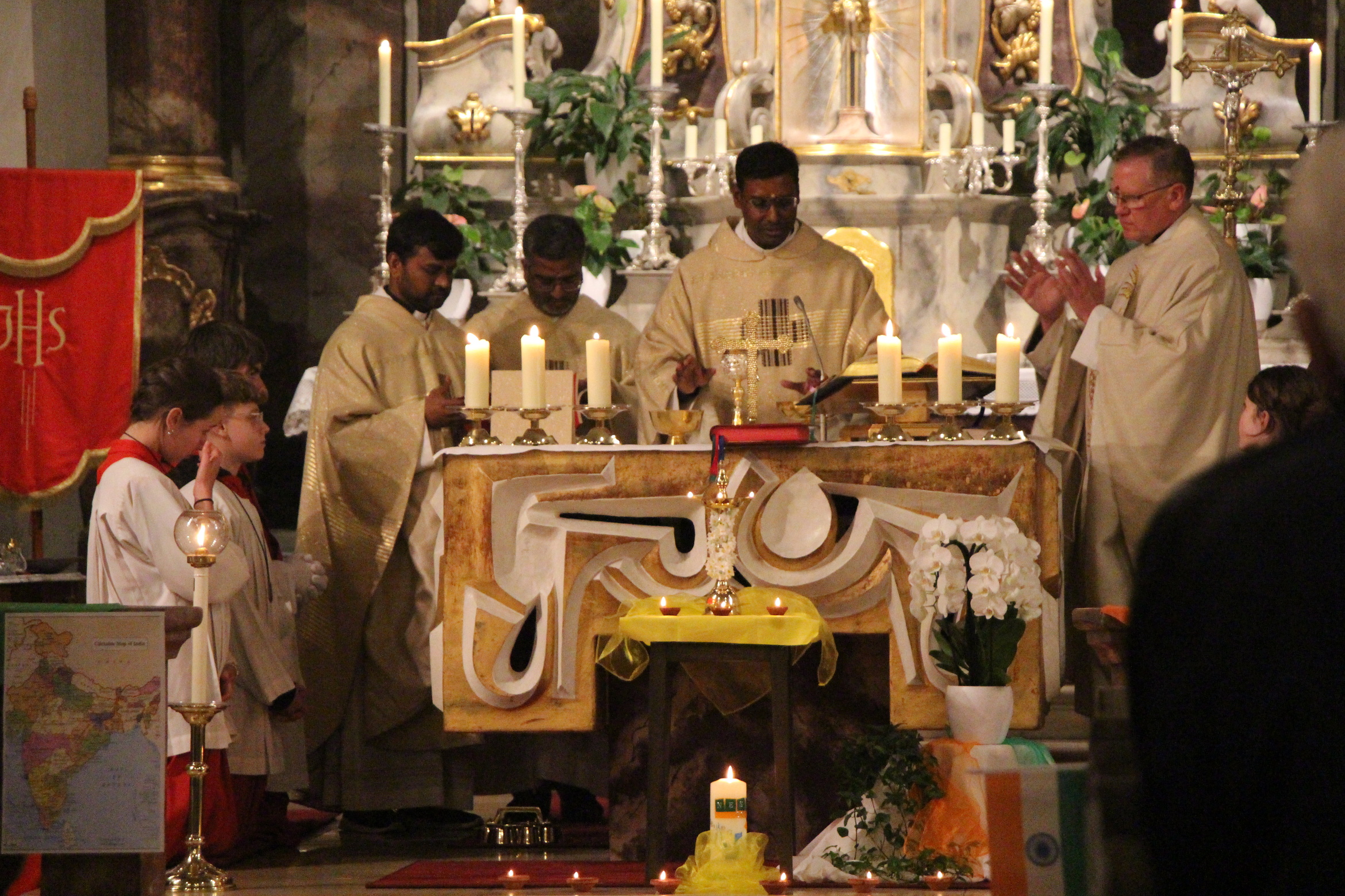 Bereits die Heilige Messe in der Pfarrkirche St. Justinus Alzenau war gut besucht und von einer besonderen Atmosphäre geprägt. Kaplan Napoleon feierte die Messe gemeinsam mit zwei Mitbrüdern aus seiner Heimatdiözese, die ebenfalls in Deutschland tätig sind sowie Pfarrer Mathiowetz. Tamilische Elemente verliehen der Eucharistiefeier eine besondere Feierlichkeit: Nach der Wandlung wurde das Arathi-Gebet gesungen und indische Ordensschwestern sowie weitere Mitwirkende sprachen Gebete in verschiedenen Sprachen. Ein liturgischer Tanz zu Ehren Gottes und eine philippinische Gesangsgruppe machten die Messe zu einem besonderen spirituellen Erlebnis.