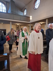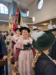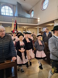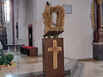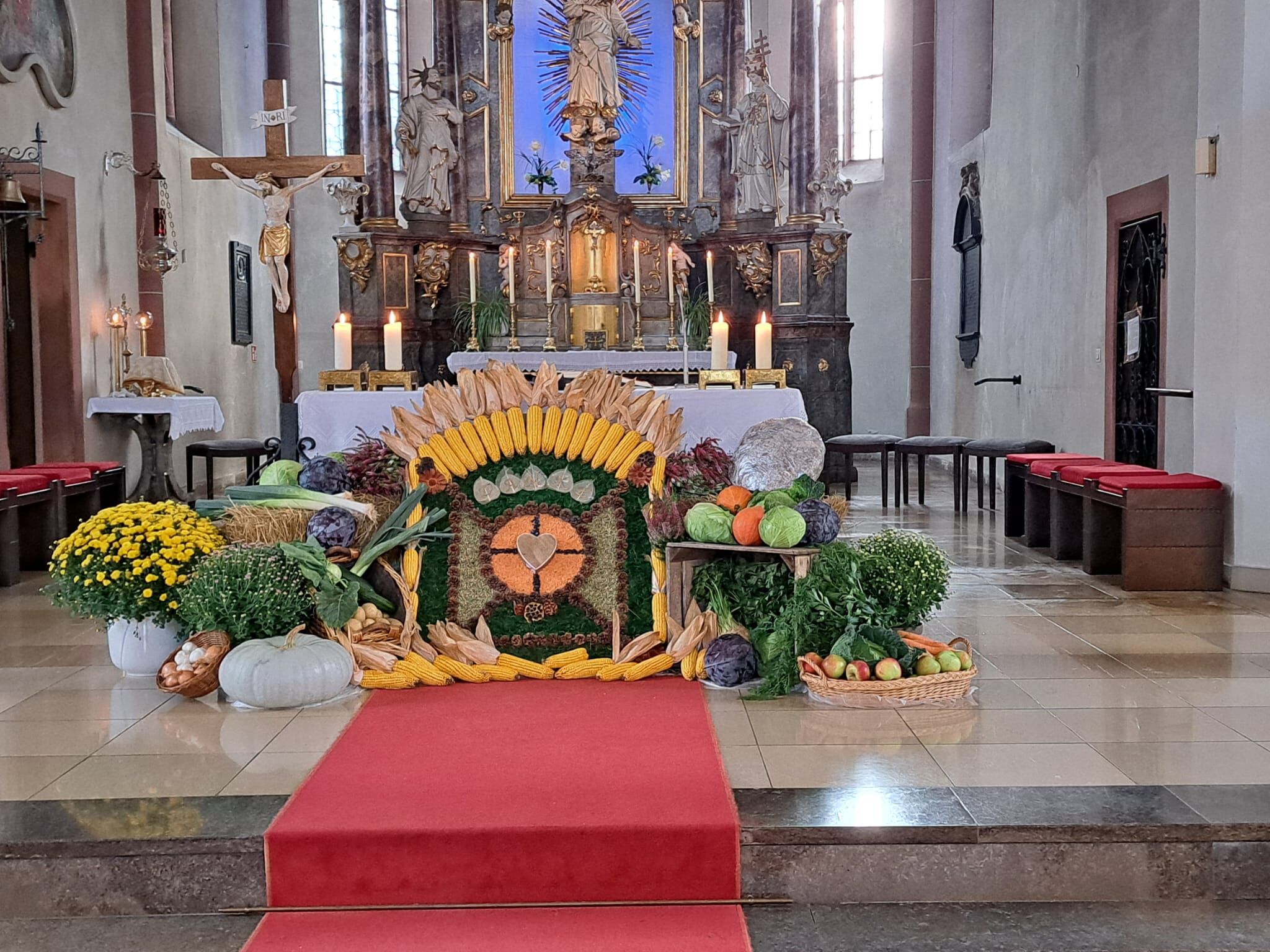Gemeinsam sind alle mit dem liturgischen Dienst und den Fahnenabordnungen in die Pfarrkirche Maria Himmelfahrt eingezogen. Die Kinder sangen ein Lied in der Kirche. Nach dem Gottesdienst fand eine Begegnung auf dem Kirchenvorplatz statt. Die heilige Messe wurde von Pfarrer im Ruhestand Helmut Grittner aus Schaafheim im Bistum Mainz mit der Gemeinde gefeiert. Ein Highlight war die „restaurierte“ große Erntekrone, welche in die Jahre gekommen war und ehrenamtlich von der Stadtgärtnerin Linda neu gebunden wurde.