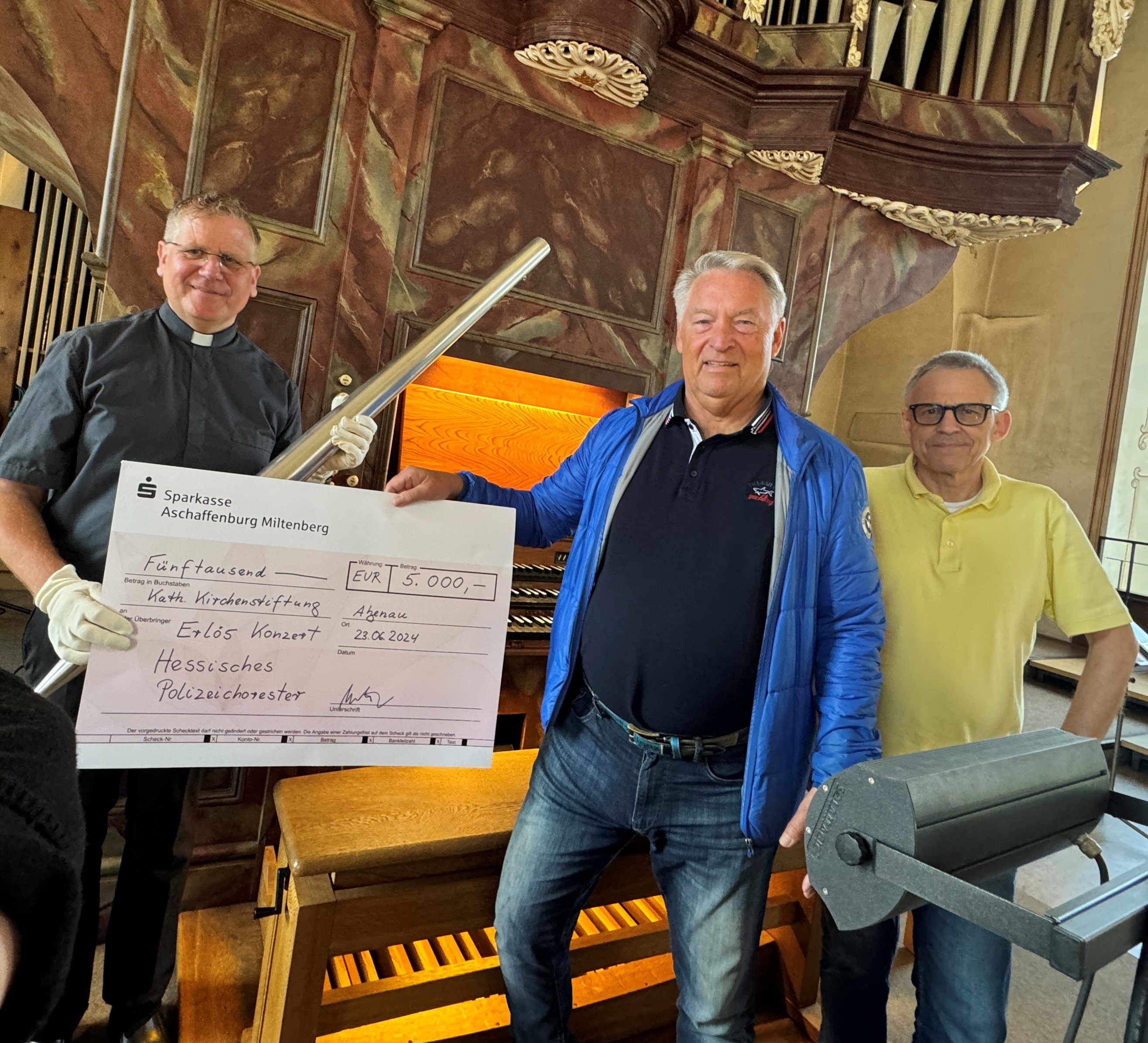 Dank des Benefizkonzerts des Landespolizeiorchesters Hessen in der Pfarrkirche St. Justinus Alzenau konnte ein beeindruckender Spendenerlös von 5000 Euro für die Orgelrenovierung erzielt werden. Das eindrucksvolle Konzert fand große Resonanz und begeisterte die Zuhörer restlos. Stadtpfarrer Frank Mathiowetz, Kirchenpfleger Stephan Schilling und Kantor Christoph Kruyer freuten sich sehr über den Erfolg der Veranstaltung und den Beginn der umfassenden Generalorgelrenovierung in St. Justinus.