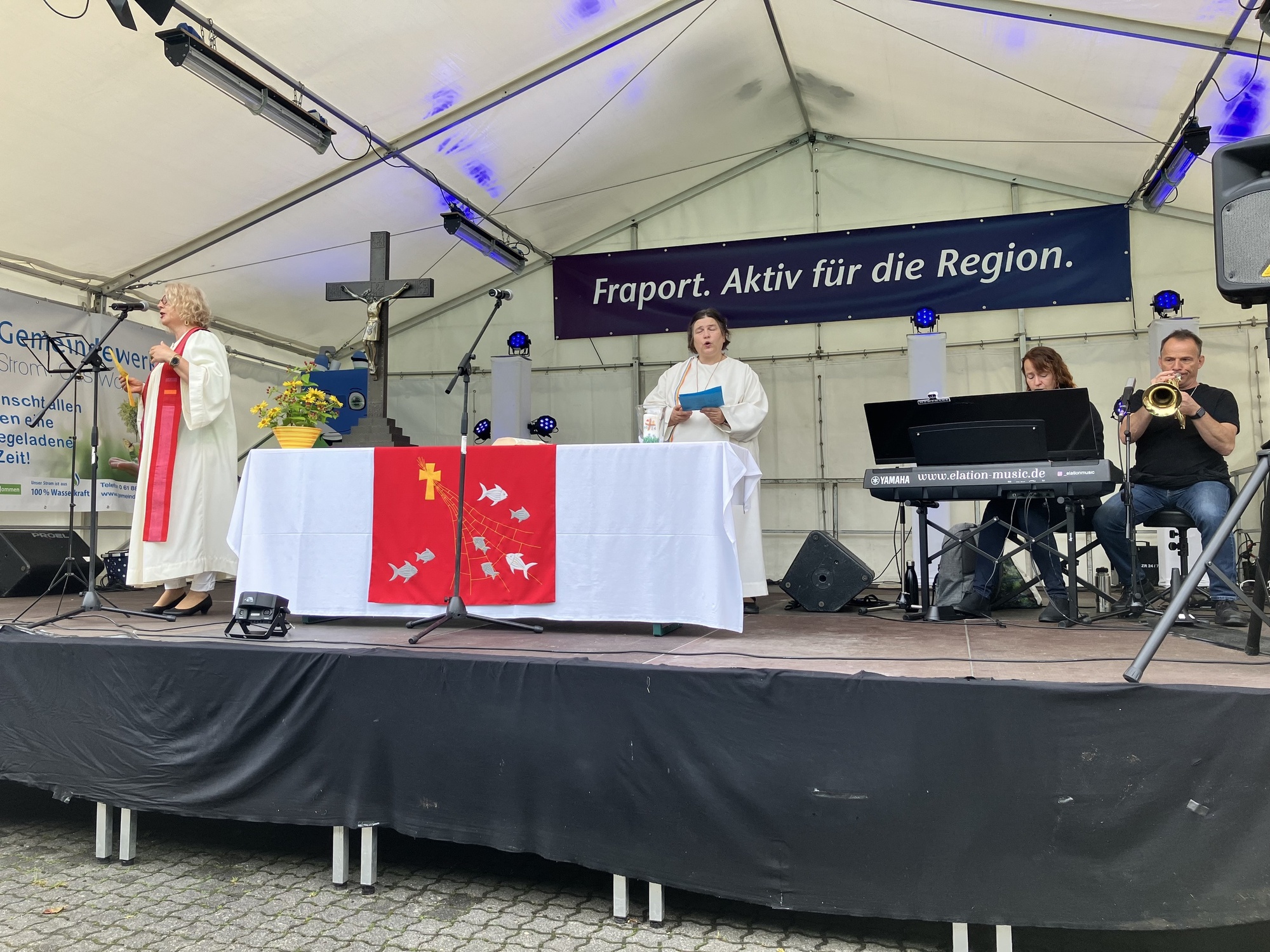 Über 100 Gottesdienstbesucher und -besucherinnen sind am Kerbsonntag früh AUFGESTANDEN, haben sich aufgemacht und sind AUFEINANDER ZUGEGANGEN, um gemeinsam den ökumenischen Kerbgottesdienst auf dem Festplatz zu feiern.