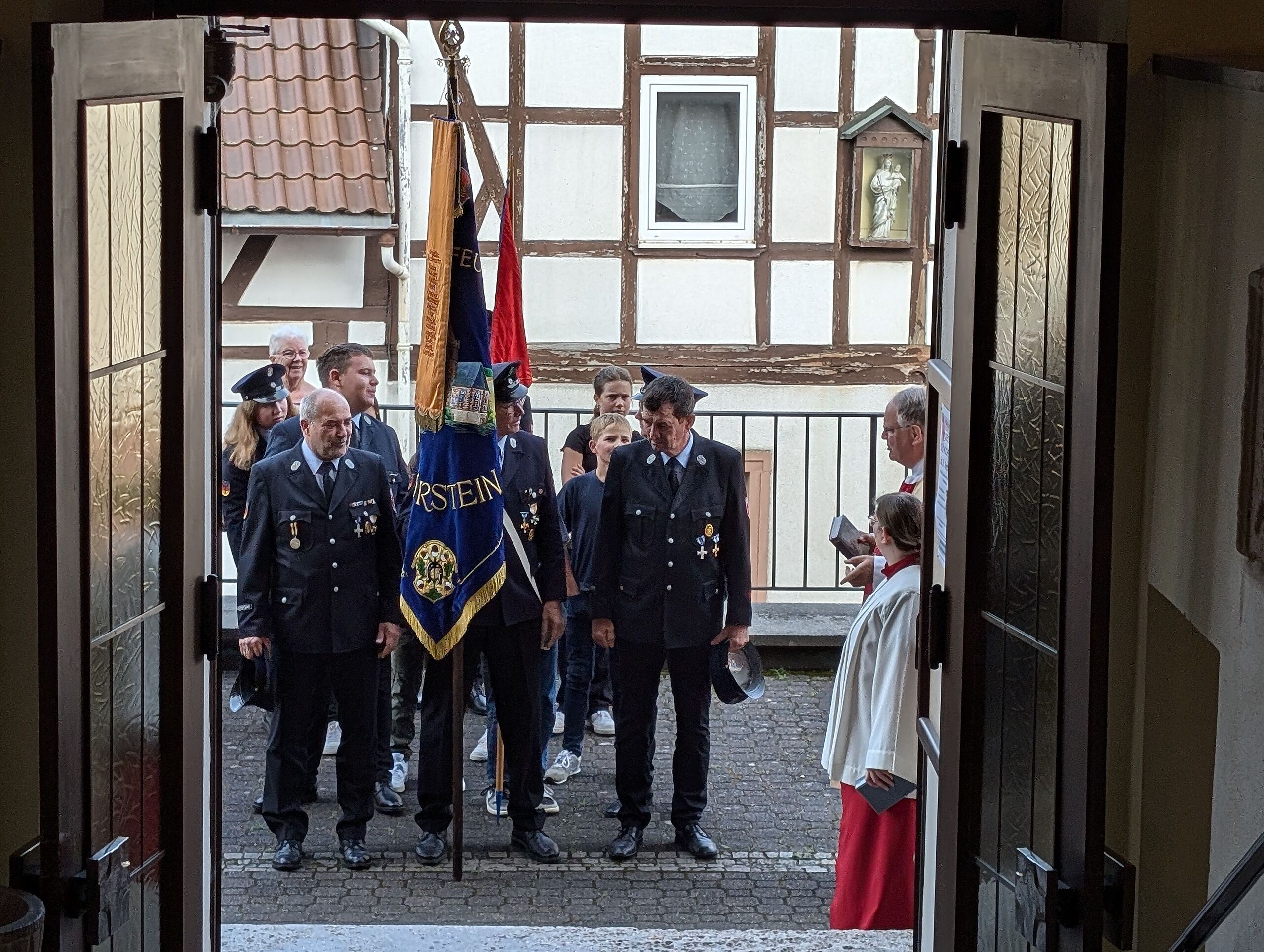 Gemeinsam mit den Mitgliedern der "Wehr" ist Pfarrer Disser feierlich in die Kirche eingezogen. Dabei führte selbstverständlich die Fahnenabordnung der Feuerwehr den Einzug an. Für die Messe wählte der Geistliche die Messtexte des Heiligen Bernhard von Clairvaux. In den Fürbitten und den Segen wurden die Feuerwehrmänner- und frauen besonders mit eingeschlossen und um besonderen Schutz und Bewahrung in ihrem verantwortungsvollen, zeitintensiven und oft auch gefährlichen Dienst gebetet. Pfarrer Disser erklärte am Ende der Messe die beiden wichtigen Heiligen Florian, der Patron der Feuerwehrleute und Bernhard von Clairvaux, den Hörsteiner Ortspatron. Er empfahl eine Fahrt besonders zum Hl. Florian. Scherzhaft fügte er noch hinzu, "vielleicht besonders für die Altersabteilung" was die Gemeinde zum schmunzeln und lächeln brachte.