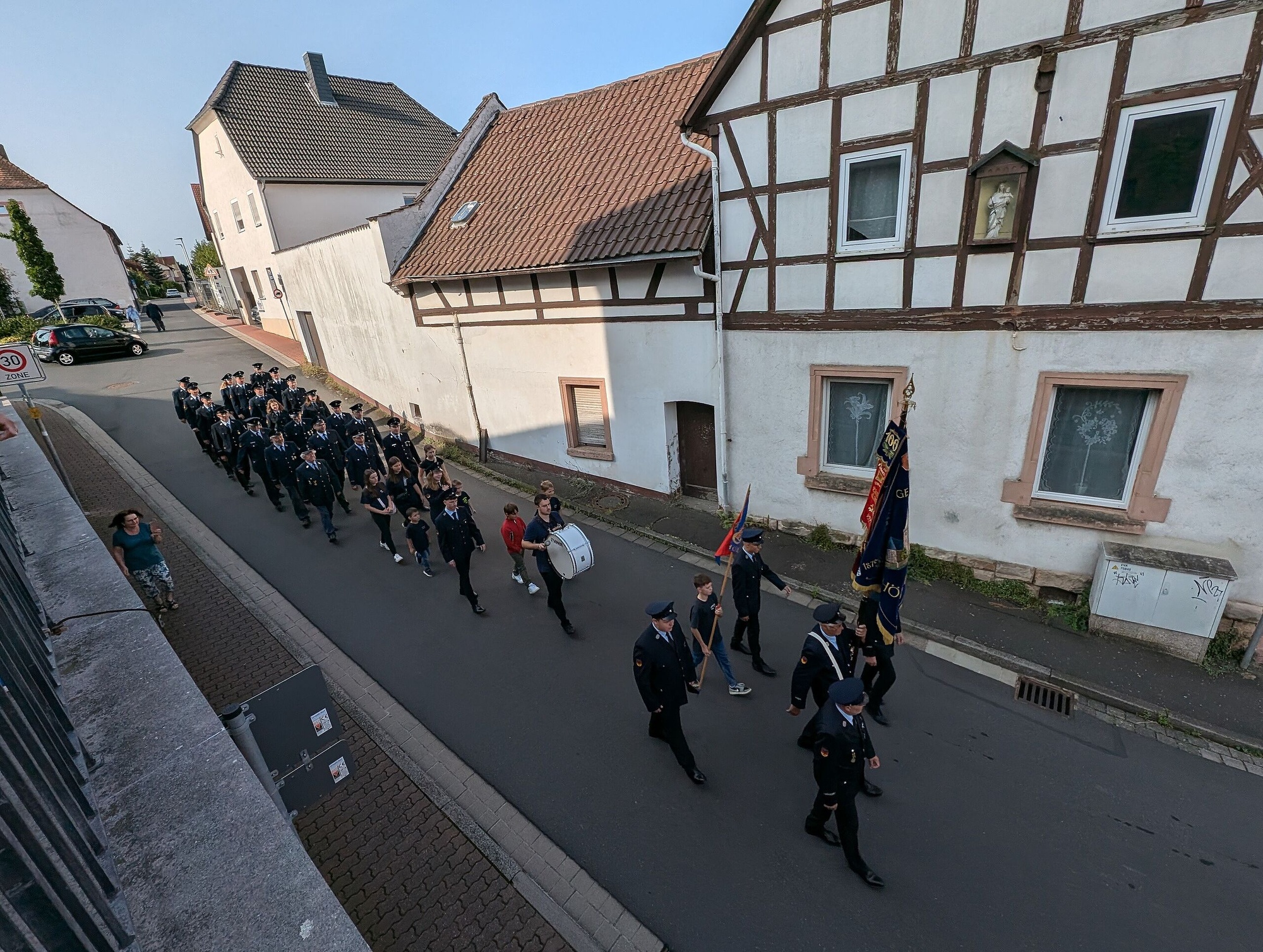 Am Ende der Messe folgte der Auszug und die Aufstellung zum Marsch an das Feuerwehrhaus und Kerbgelände. Dabei gab ein Paukenschlag den Marschschritt an. Als Zeichen der Anerkennung und Würdigung nahm Alzenaus zweiter Bürgermeister Helmut Schuhmacher (CSU) an der Messfeier teil. Für die Feuerwehrmänner- und frauen folgt ein Frühschoppen. Ab Mittag ist dann der dritte und letzte Tag der "Hörschter Kerb" mit Festbetrieb und Kerbtanz. Die Zeltkerb wird von der Feuerwehr für den Ort ausgerichtet. "Kerbleger" ist der Ortspatron, der heilige Bernhard von Clairvaux, der seinen Gedenktag am 20. August feiert. Das stellt eine Besonderheit da, da in vielen Gemeinden der "Kirchweihtag" den Zeitpunkt der "Kerb" anzeigt.