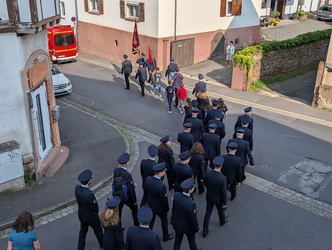 Am Ende der Messe folgte der Auszug und die Aufstellung zum Marsch an das Feuerwehrhaus und Kerbgelände. Dabei gab ein Paukenschlag den Marschschritt an. Als Zeichen der Anerkennung und Würdigung nahm Alzenaus zweiter Bürgermeister Helmut Schuhmacher (CSU) an der Messfeier teil. Für die Feuerwehrmänner- und frauen folgt ein Frühschoppen. Ab Mittag ist dann der dritte und letzte Tag der "Hörschter Kerb" mit Festbetrieb und Kerbtanz. Die Zeltkerb wird von der Feuerwehr für den Ort ausgerichtet. "Kerbleger" ist der Ortspatron, der heilige Bernhard von Clairvaux, der seinen Gedenktag am 20. August feiert. Das stellt eine Besonderheit da, da in vielen Gemeinden der "Kirchweihtag" den Zeitpunkt der "Kerb" anzeigt.