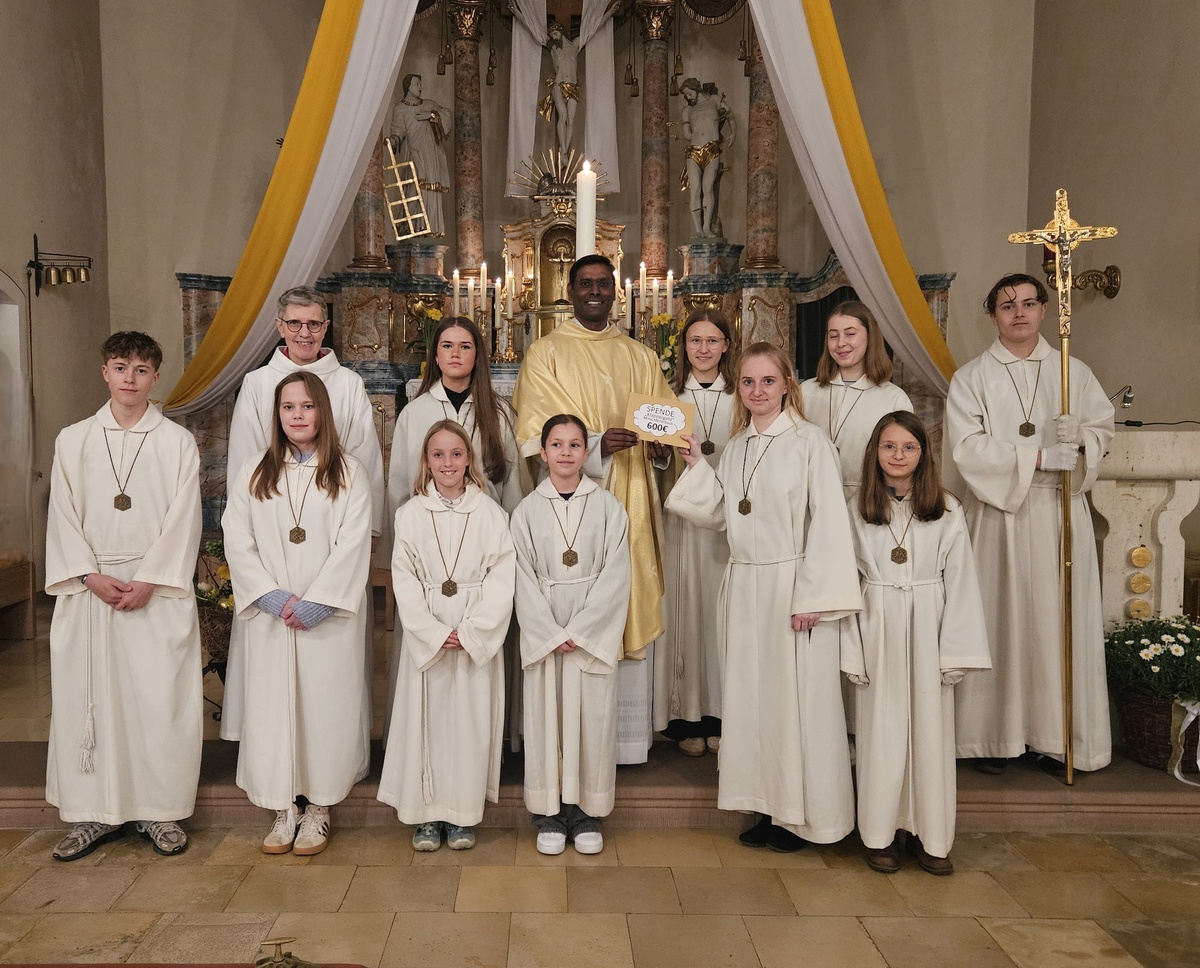 Da die Spendensumme überragend hoch ausgefallen ist, entschied sich die Leiterrunde zusätzlich das Projekt von Pfarrvikar Dr. Napoleon Savariraj in Indien mit einer Geldsumme von 600 Euro zu unterstützen. Oberministrantin Juliette Huth überreichte die Spendensumme in der Osternacht und dankte der Gemeinde für die zahlreichen Spenden. Pfarrvikar Dr. Savariraj bedankte sich für die gelungene Überraschung insbesondere bei den Klapperkindern, die diese mit ihrem Einsatz erreicht haben.