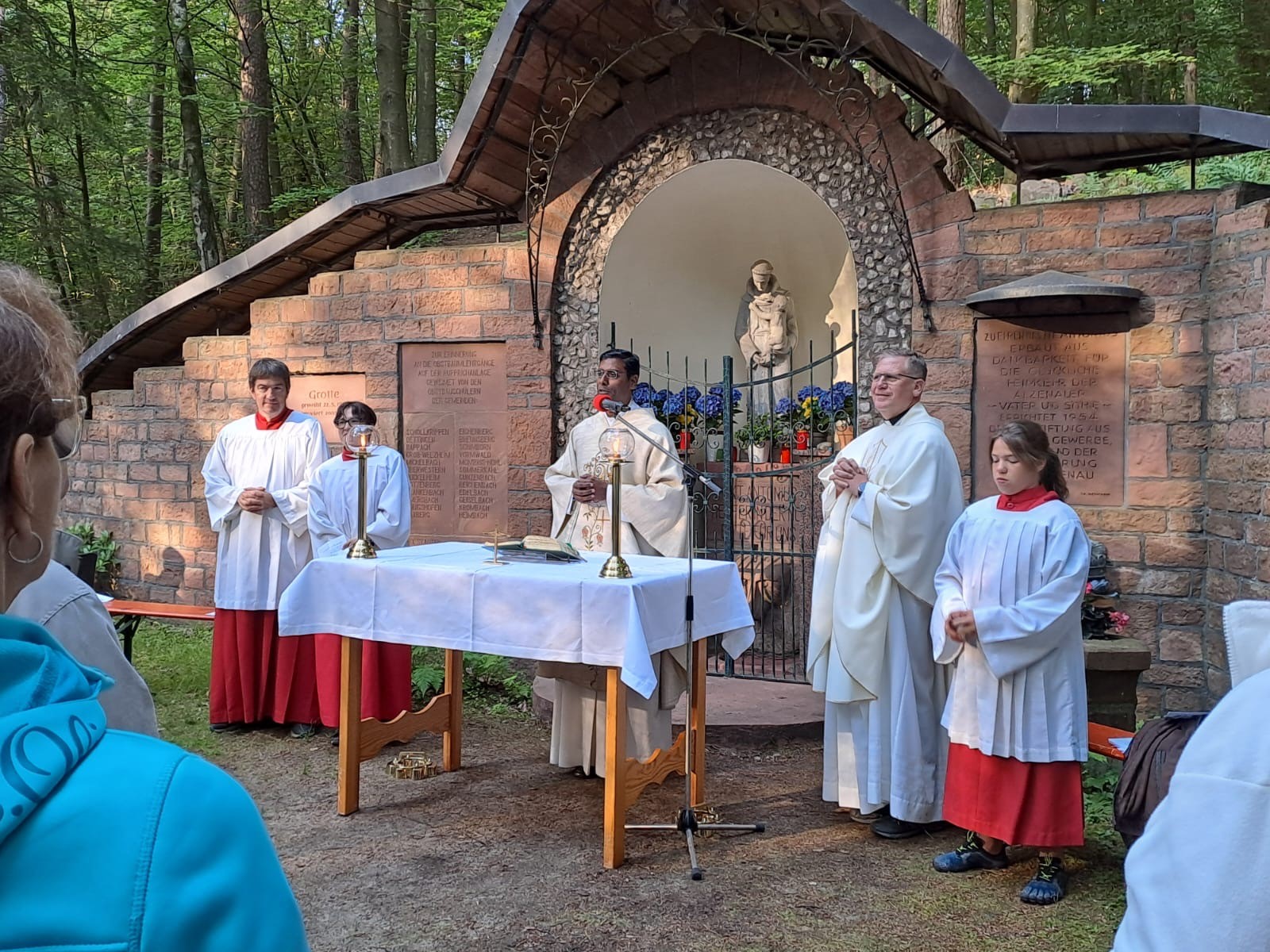 Unter großer Beteiligung der Gläubigen fand am Gedenktag des Heiligen Antonius von Padua eine Messfeier statt. Die idyllisch gelegene Antoniusgrotte im Alzenauer „Rupprich“ bot den perfekten Rahmen für die Heilige Messe, die von Kaplan Napoleon Savariraj zelebriert wurde. In seinen Begrüßungsworten erzählte er, dass ihn einer seiner ersten Spaziergänge in Alzenau eher zufällig zur Antoniusgrotte geführt habe und er von diesem besonderen Ort schon bei seinem ersten Besuch sehr beeindruckt gewesen sei.