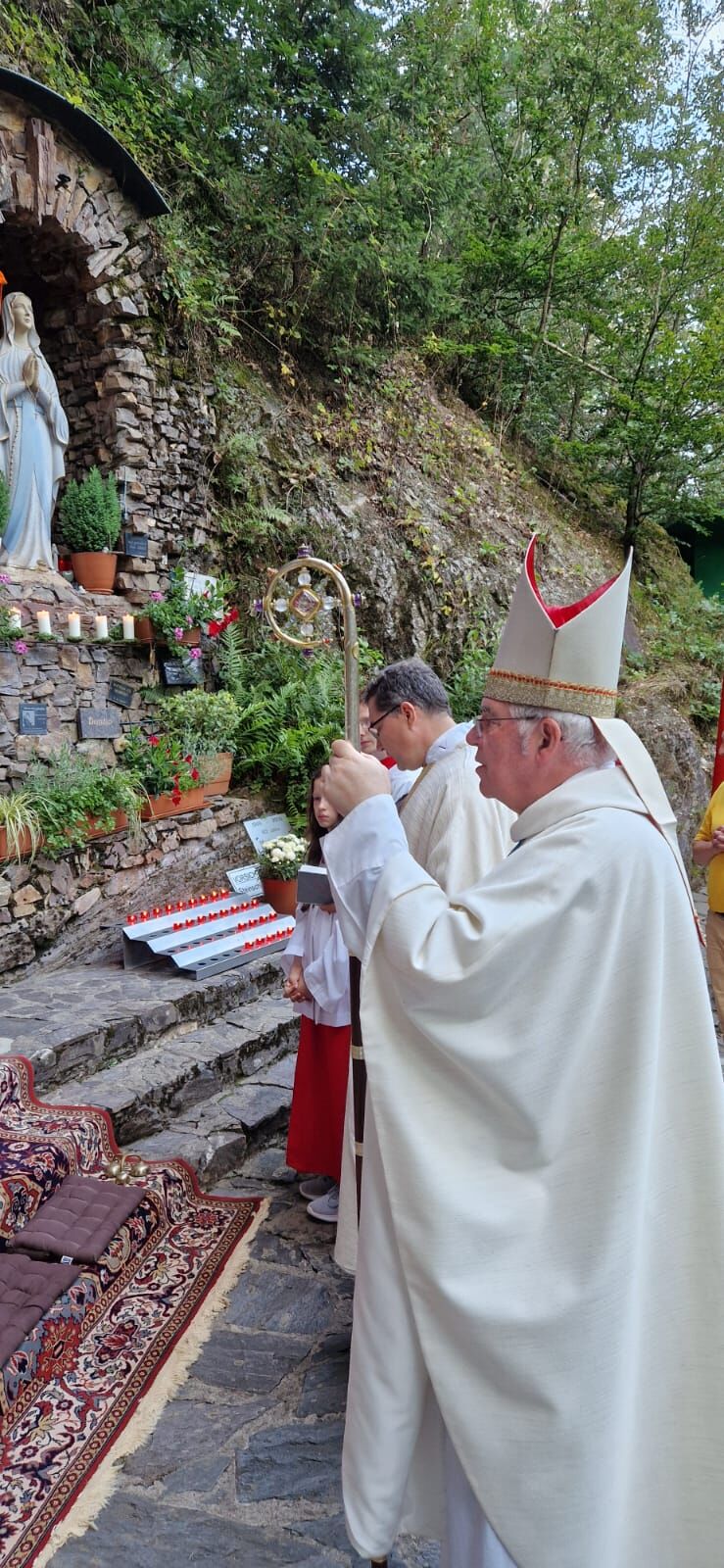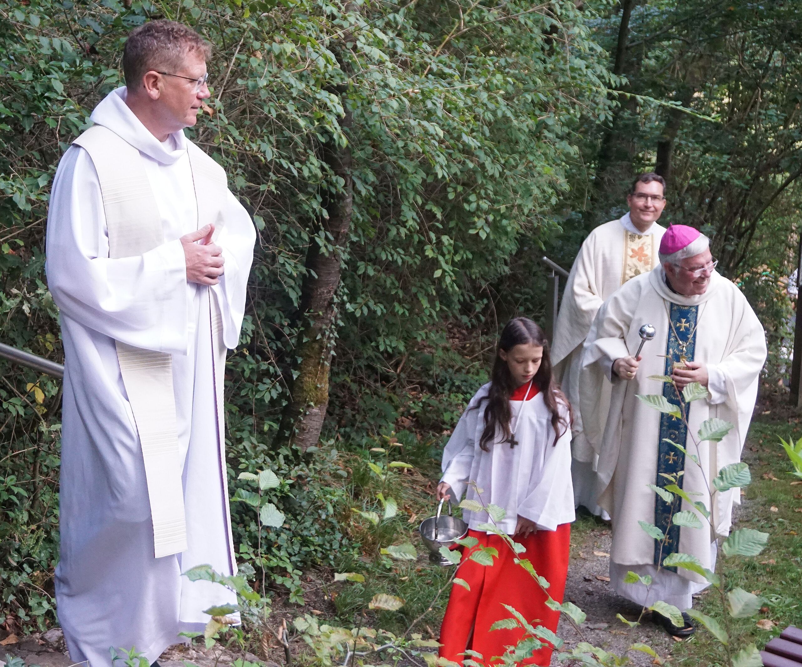 Die Grotte in Horbach wurde vor 75 Jahren von der Familie des Weihbischofs errichtet. Aus diesem Anlass wurde das Jubiläum mit einem Pontifikalamt gefeiert. Die Lourdesgrotte, welche in der Natur gelegen ist, lädt zum Verweilen in der Natur und zum persönlichen Gebet ein. Es ist ein beliebtes Wander- und Pilgerziel, mit unter auch für Fahrradwallfahrten. Im Anschluss an die Messe berichtete Pfarrer Mathiowetz dem Weihbischof, das nun die Probebohrung in der neuen Kälberauer Wallfahrtskirche durchgeführt wurde und man auf das Ergebnis warte. Wenn keine Gefahr bestehen sollte, können die Wallfahrten wieder in Kälberau stattfinden, wo der Weihbischof selbstverständlich ein gern gesehener Gast ist.