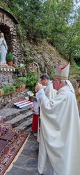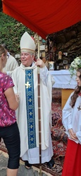 Die Grotte in Horbach wurde vor 75 Jahren von der Familie des Weihbischofs errichtet. Aus diesem Anlass wurde das Jubiläum mit einem Pontifikalamt gefeiert. Die Lourdesgrotte, welche in der Natur gelegen ist, lädt zum Verweilen in der Natur und zum persönlichen Gebet ein. Es ist ein beliebtes Wander- und Pilgerziel, mit unter auch für Fahrradwallfahrten. Im Anschluss an die Messe berichtete Pfarrer Mathiowetz dem Weihbischof, das nun die Probebohrung in der neuen Kälberauer Wallfahrtskirche durchgeführt wurde und man auf das Ergebnis warte. Wenn keine Gefahr bestehen sollte, können die Wallfahrten wieder in Kälberau stattfinden, wo der Weihbischof selbstverständlich ein gern gesehener Gast ist.