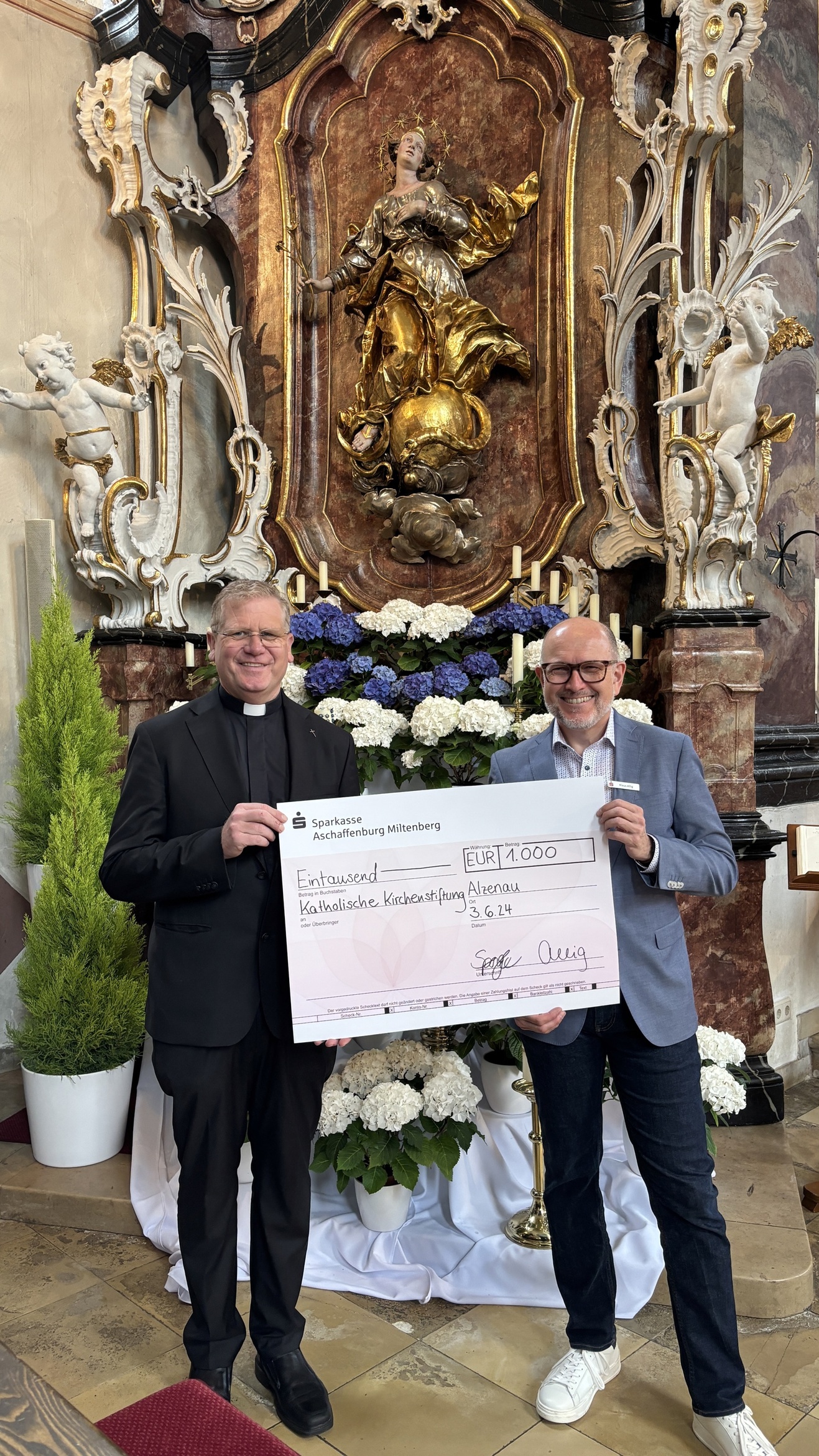 Direktor der Sparkasse Klaus Allig übergab eine Spende von 1.000,00 € an Stadtpfarrer Frank Mathiowetz für die Renovierung des Marienaltars in der Pfarrkirche St. Justinus Alzenau. Dieser war durch den "Zahn der Zeit" renovierungsbedürftig, zudem war der Holzwurm aktiv. Außerdem wies der Altar weitere Schäden auf, die fachkundig vom Restaurator Christoph Schädel aus Randersacker behoben wurden. Pfarrer Frank Mathiowetz dankte Herrn Allig und der Sparkasse für die wertvolle Unterstützung dieser Maßnahme und die gute Zusammenarbeit.