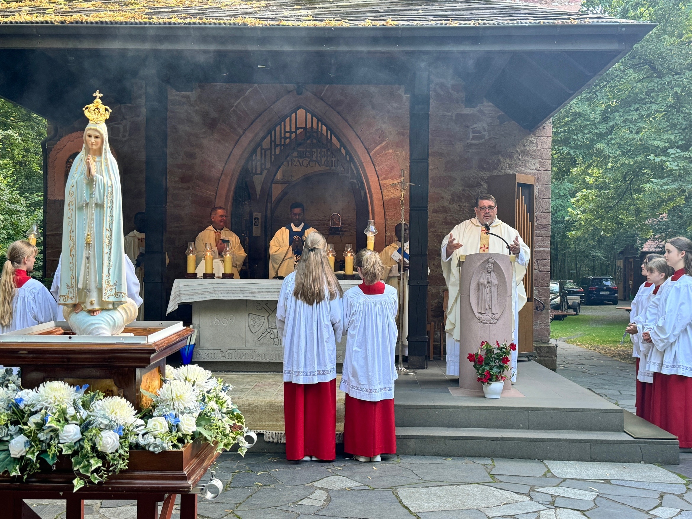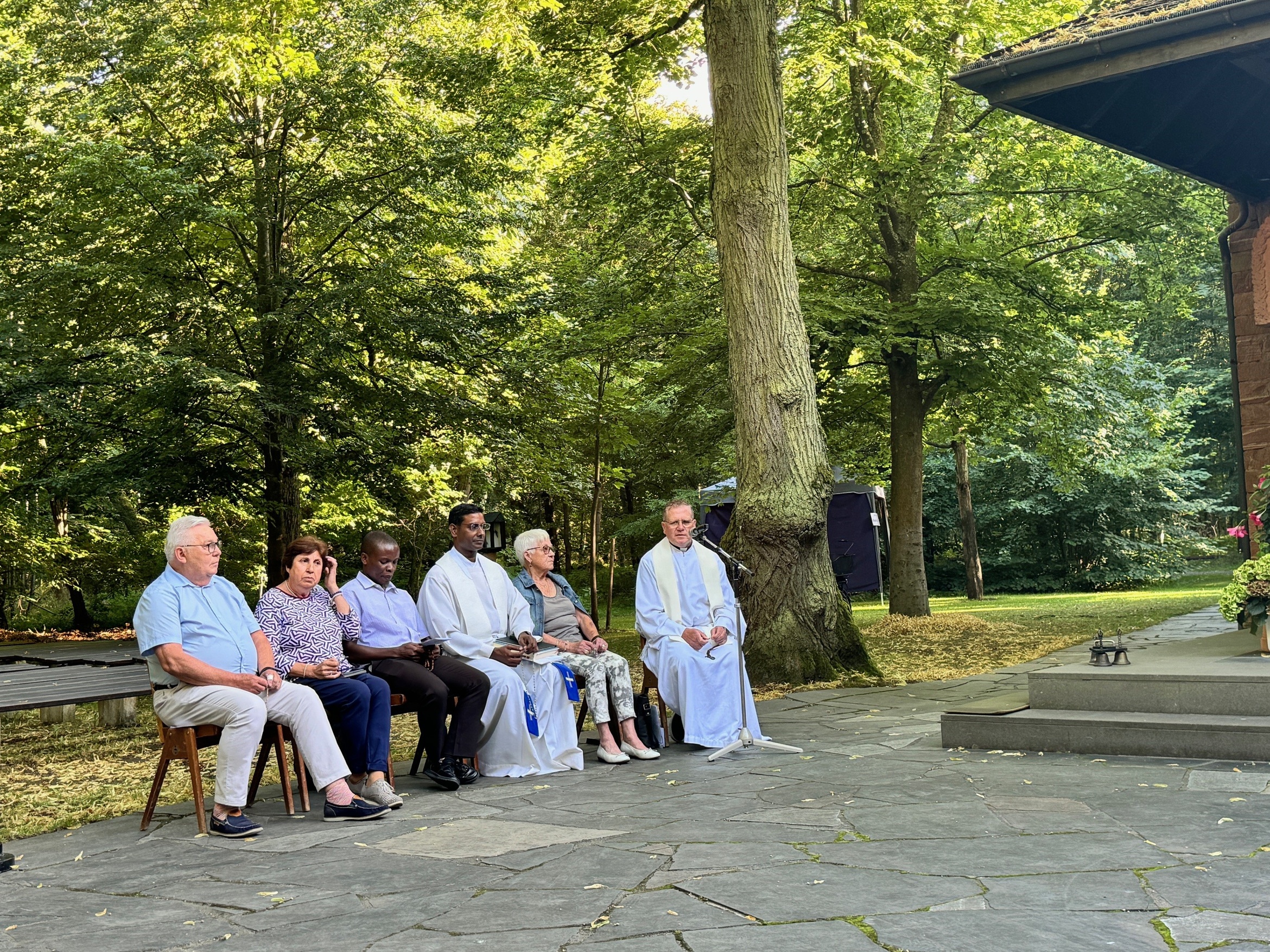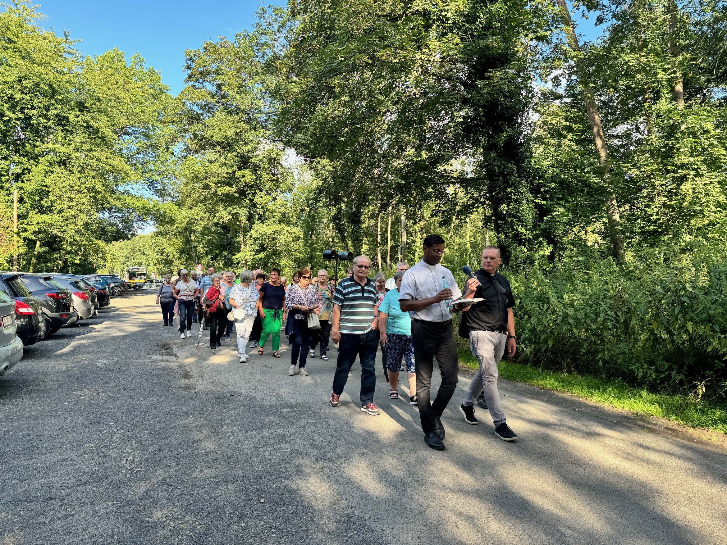 Zunächst zogen sie in einer feierlichen Prozession bei strahlendem Sonnenschein singend und betend zum Pilgerort im Wald. Die Teilnehmer aus dem Bistum Würzburg wurden herzlich von Pfarrer und Wallfahrtsdirektor Thomas Weiß aus Klein-Krotzenburg begrüßt, der sich über die rege Beteiligung der bayerischen Pilger aus Unterfranken sichtlich freute. Zuvor beteten die Teilnehmer den internationalen Rosenkranz in Italienisch, Polnisch, Tamil, Kiswahili und Deutsch.