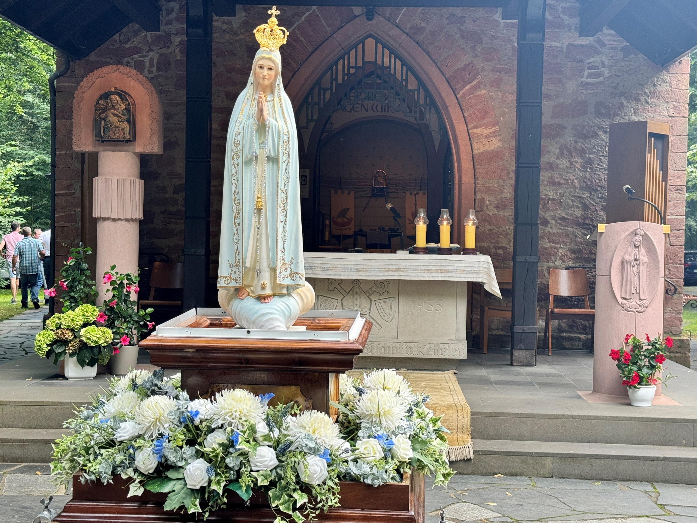 Rund 60 Pilger machten sich unter der Leitung von Pfarrer Frank Mathiowetz auf den Weg zur "Liebfrauenheide", einem idyllischen Marienwallfahrtsort im Bistum Mainz. Die Wallfahrer aus dem Pastoralen Raum Alzenau nahmen an der Heiligen Messe zum Fatimatag teil, die unter freiem Himmel stattfand.