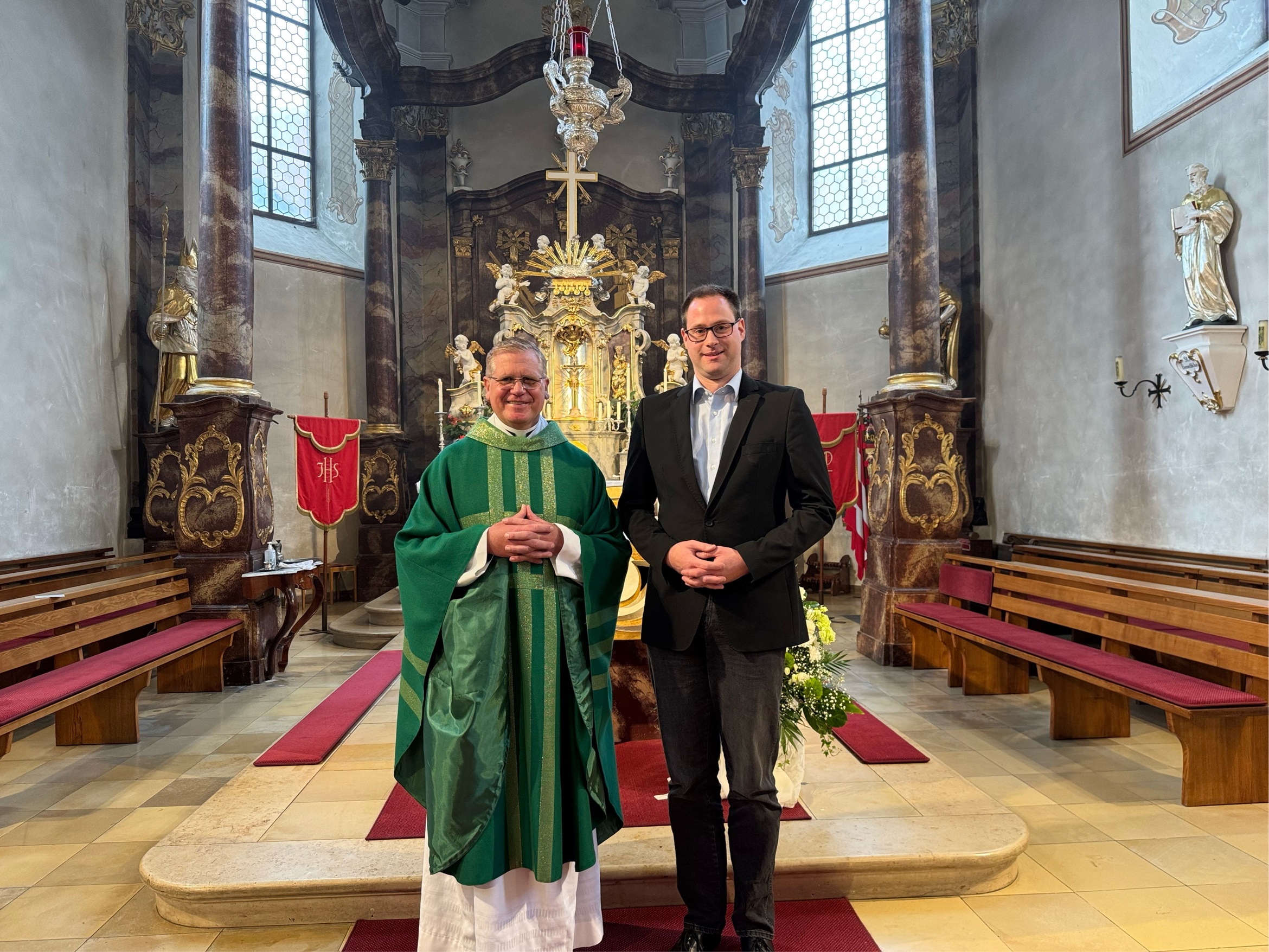 Mit großer Freude begrüßte Stadtpfarrer Frank Mathiowetz den neuen Kantor Marcel Schwarz herzlich und überreichte ihm als Willkommensgruß ein Gotteslob mit dem Eigenteil des Bistums Würzburg. Dabei wies er humorvoll darauf hin, dass in Alzenau gerne „fränkische Lieder“ gesungen werden.