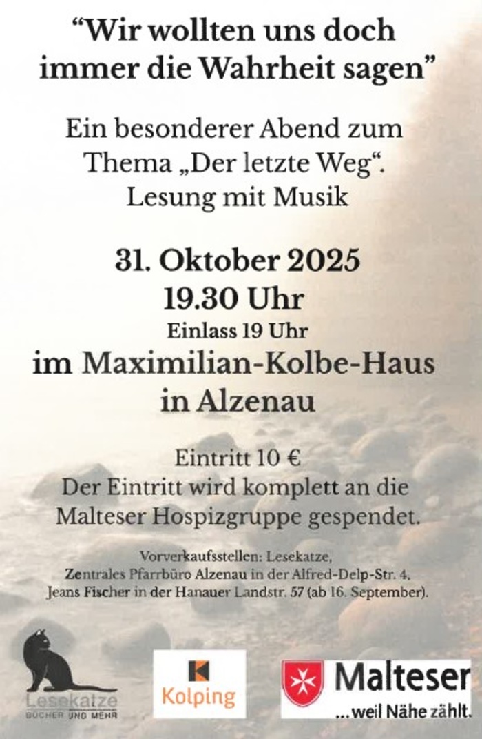 Am Freitag, den 31. Oktober 2025, beginnt um 19:30 Uhr (Einlass ab 19:00 Uhr) im Maximilian-Kolbe-Haus in Alzenau eine Lesung mit Musik unter dem Titel „Wir wollten uns doch immer die Wahrheit sagen“.