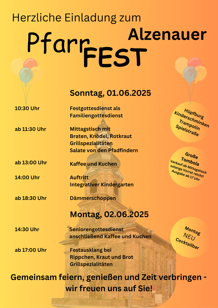 Am Sonntag, den 01. Juni 2025, und Montag, den 02. Juni 2025, laden wir Sie herzlich zum Pfarrfest in Alzenau ein. Freuen Sie sich auf ein buntes Programm, kulinarische Leckerbissen und fröhliches Beisammensein für die ganze Familie!
