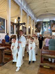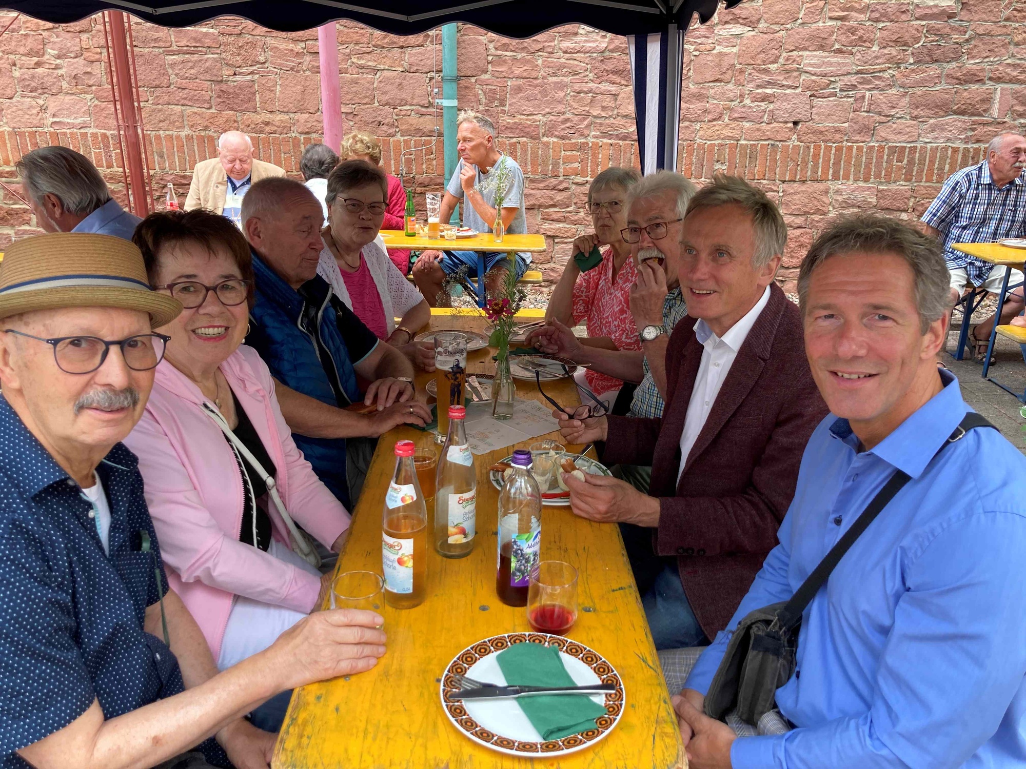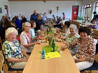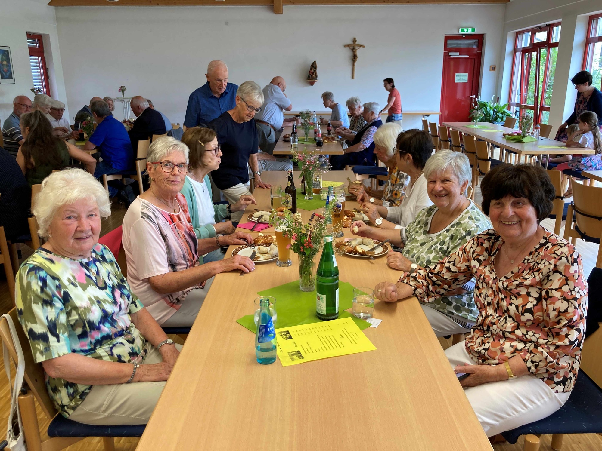 Danach war zum Frühschoppen im Pfarrsaal sowie im Innenhof zwischen Kirche und Pfarrheim eingeladen worden. Für die Weißwürste mit Laugenzopf und das Käsetrio war wegen der besseren Planung um Vorbestellung gebeten worden, aber auch kurzentschlossene Gäste mussten nicht hungrig bleiben. Sowohl unter den Pavillons im Hof als auch im Pfarrsaal wurde die Gelegenheit zu Gesprächen mit Freunden und Bekannten lebhaft genutzt.