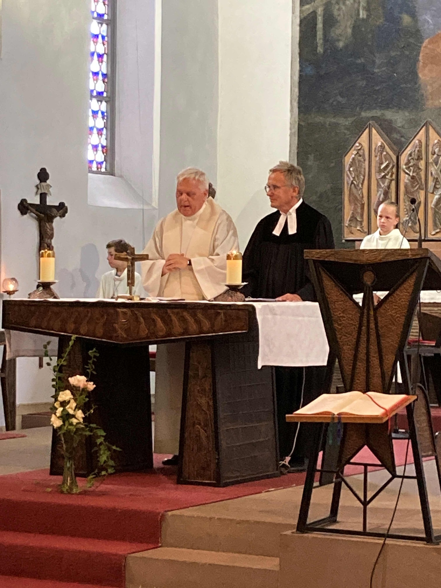 Anlässlich der 1050Jahr-Feier Dettingen und der 50Jahr-Feier Karlstein begann der Sonntag mit einem ökumenischen Jubiläumsgottesdienst in der Pfarrkirche, dem Pfarrer Krzysztof Sierpien und Pfarrer Christian Riewald vorstanden. Dominike Trageser an der Orgel, Johannes Würmseer an der Piccolo-Trompete und die Solistin Anna Lucia Leone trugen zu der festlichen Ausgestaltung der Wortgottesfeier maßgeblich bei.