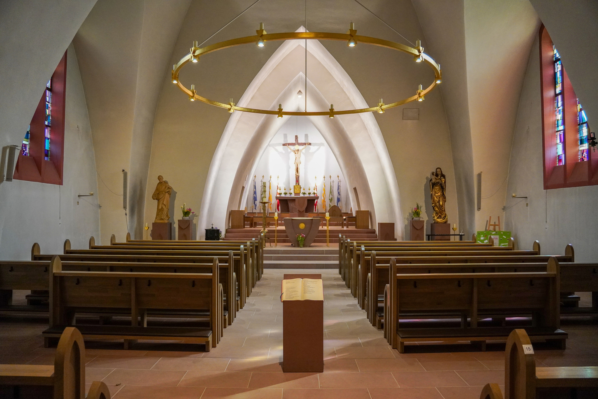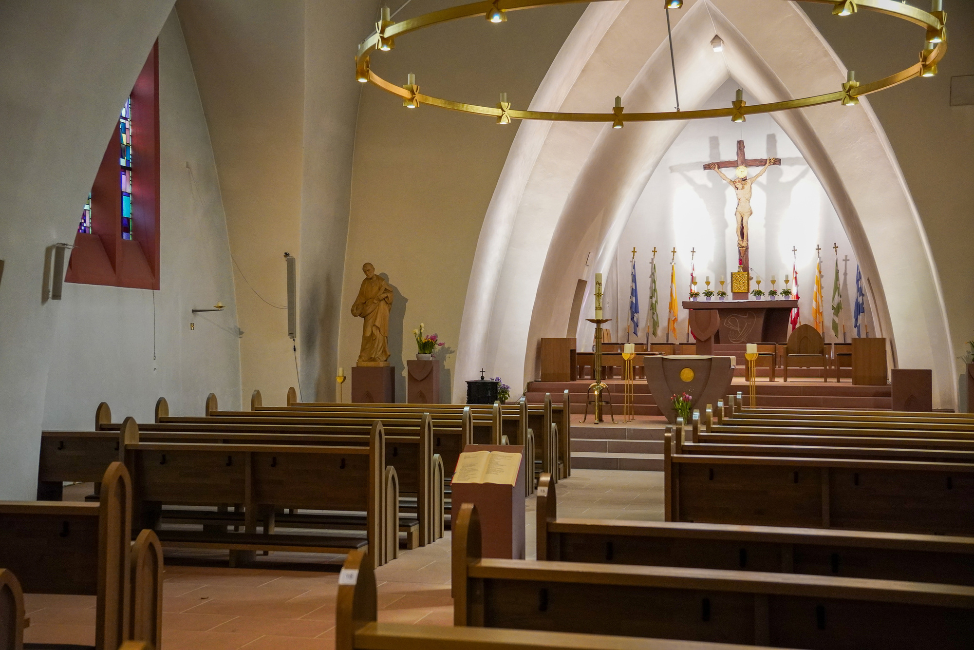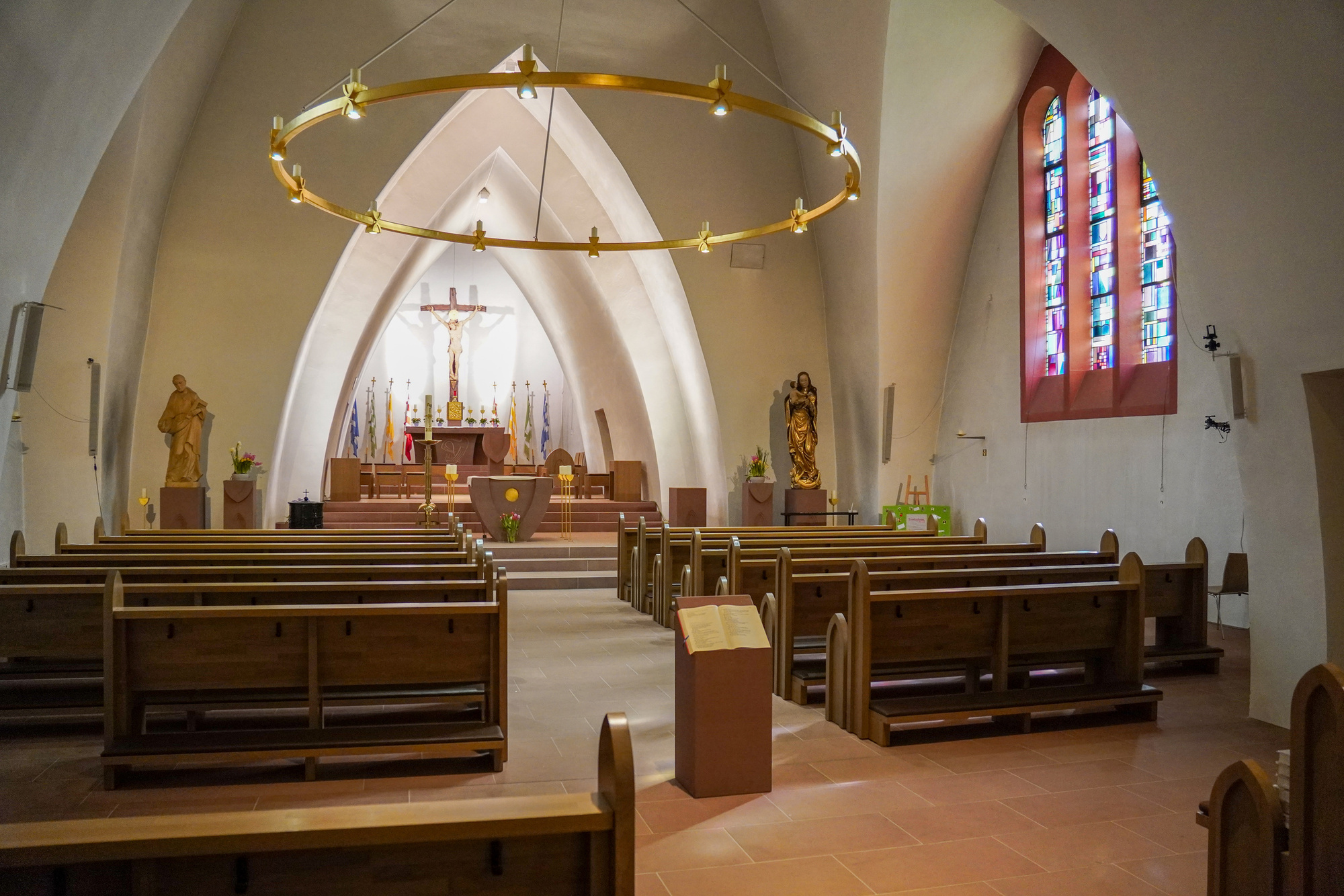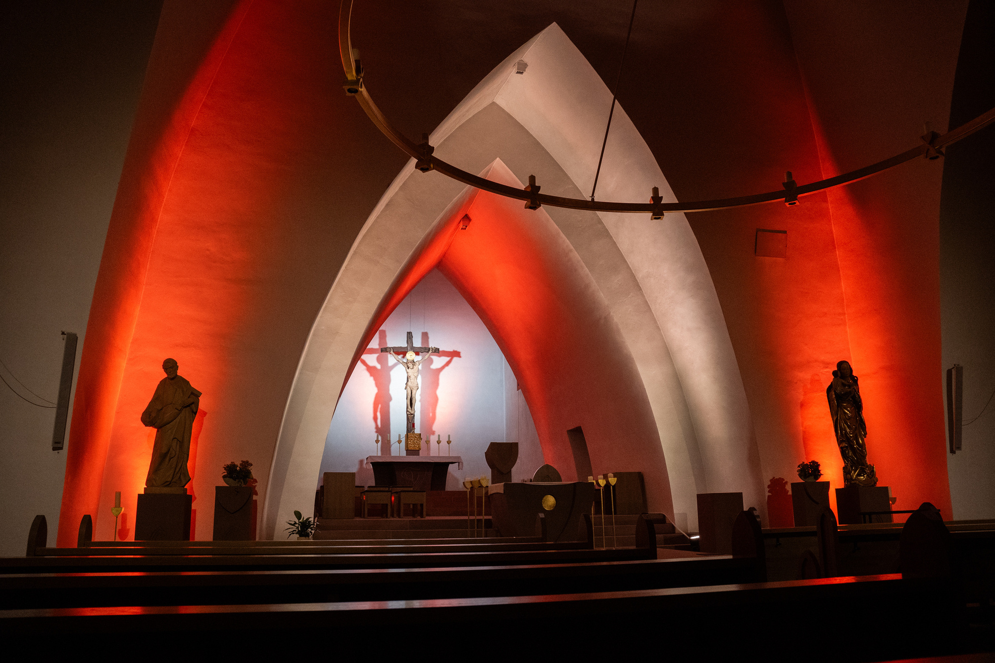 Neben dem Weiten und Verengen der aufeinanderfolgenden Raumkompartimente ist die Lichtführung bei Dominikus Böhm von entscheidender Bedeutung für die Raumwirkung. Die von den Kölner Werkschulen gestalteten Farbfenster lassen das Licht in unterschiedlichen dunklen Farbtönen einströmen. Einzig der Altarraum ist hell belichtet. An dieser Stelle steht der Altar mit dem Tabernakelgehäuse von Br. Adelmar Dölger aus Münsterschwarzach (beides 1957) und dem monumentalen Kruzifixus von Heinrich Wohlfahrt aus Steinheim (1960). Bereits 1941 hatte der Bildhauer eine Herz-Jesu-Büste und eine des Kirchenpatrons gefertigt. Die überlebensgroßen Statuen befinden sich heute im Depot des Heimatmuseums bzw. im Pfarrheim.