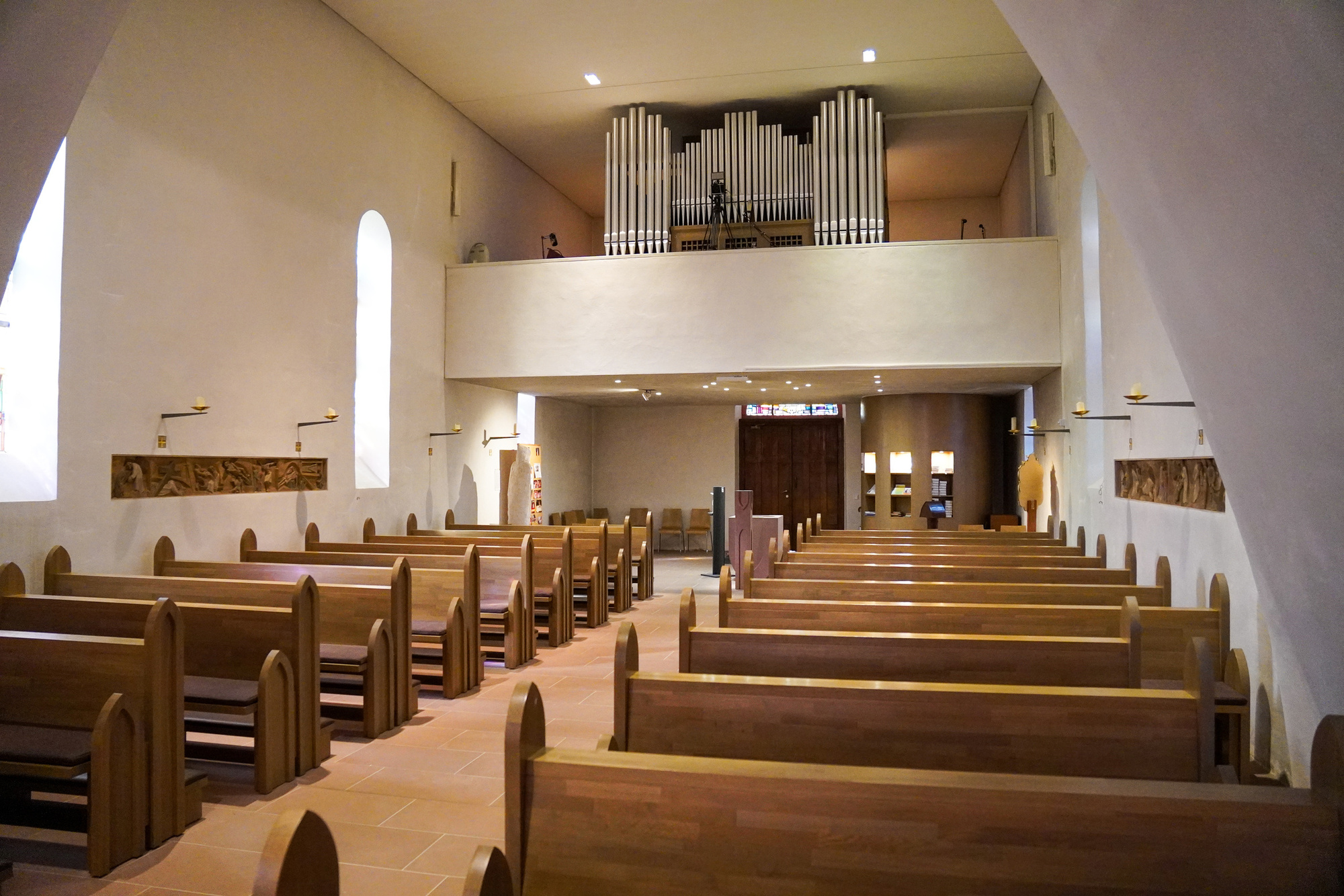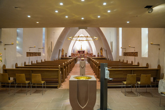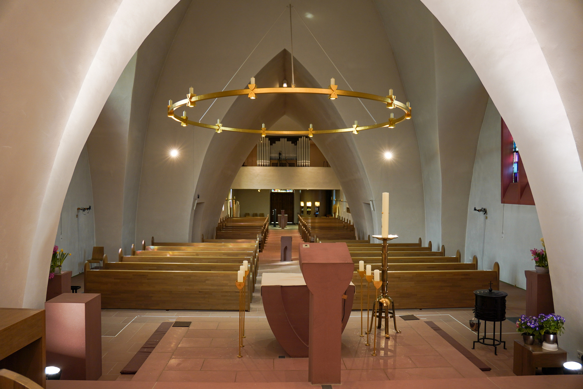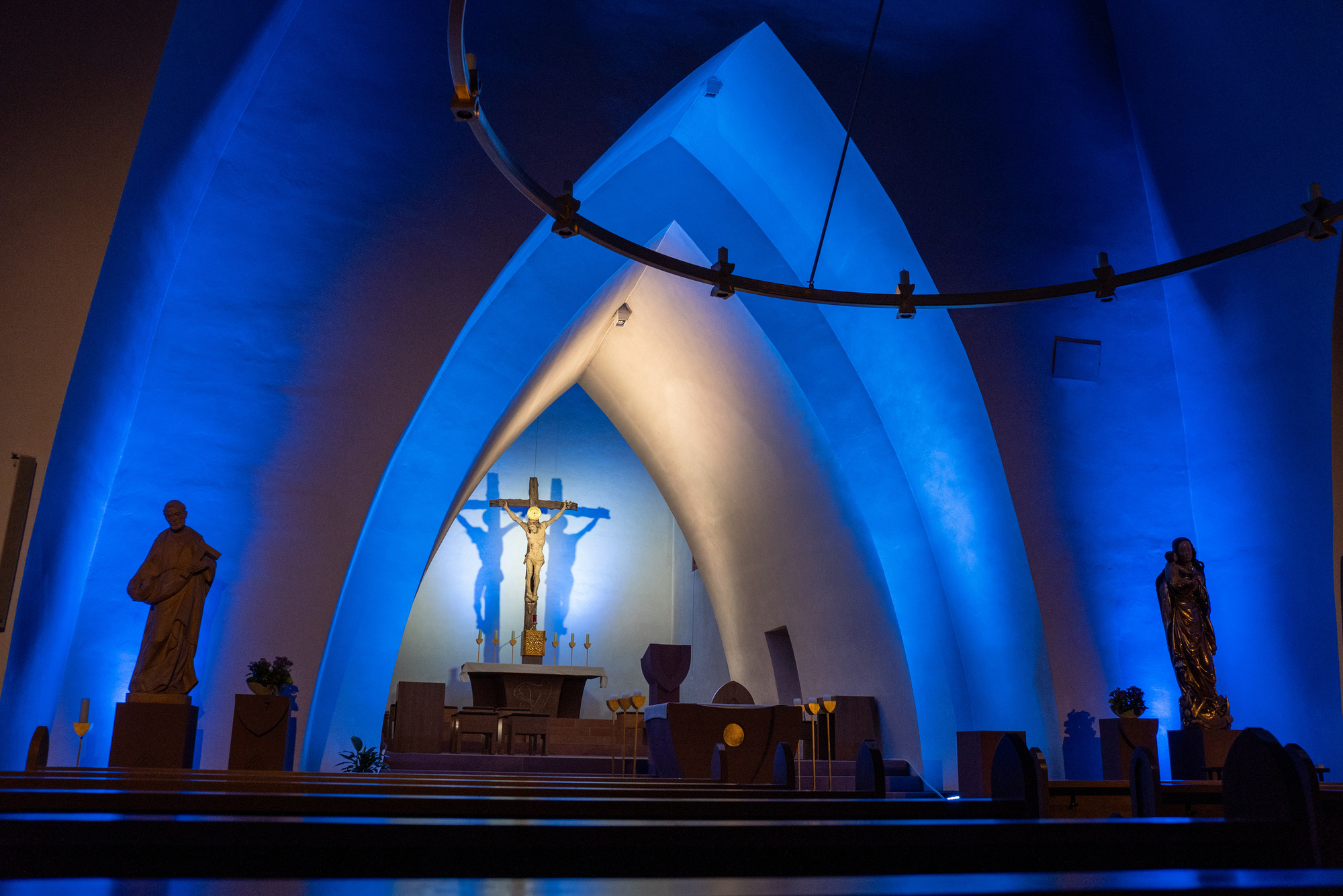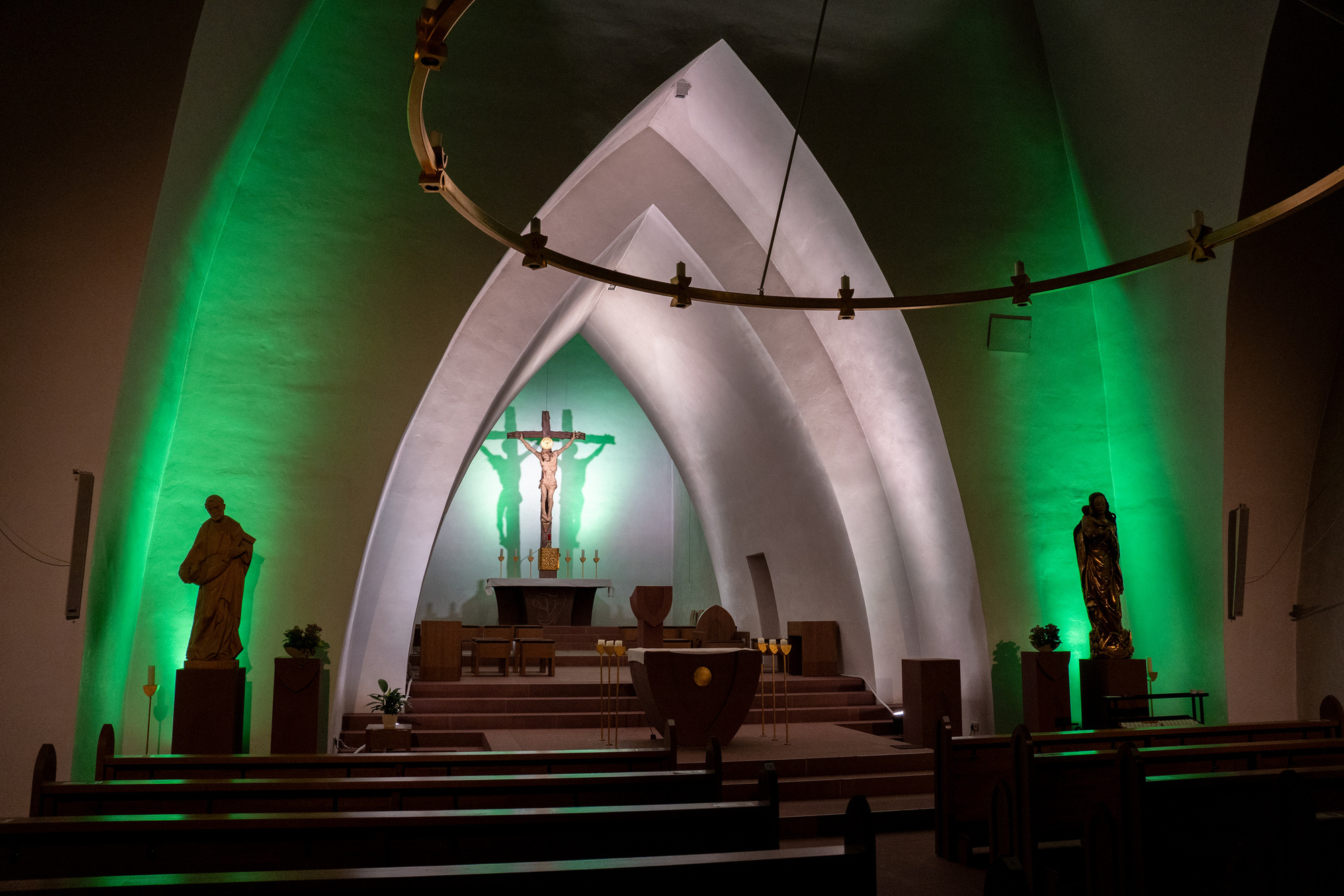 Neben dem Weiten und Verengen der aufeinanderfolgenden Raumkompartimente ist die Lichtführung bei Dominikus Böhm von entscheidender Bedeutung für die Raumwirkung. Die von den Kölner Werkschulen gestalteten Farbfenster lassen das Licht in unterschiedlichen dunklen Farbtönen einströmen. Einzig der Altarraum ist hell belichtet. An dieser Stelle steht der Altar mit dem Tabernakelgehäuse von Br. Adelmar Dölger aus Münsterschwarzach (beides 1957) und dem monumentalen Kruzifixus von Heinrich Wohlfahrt aus Steinheim (1960). Bereits 1941 hatte der Bildhauer eine Herz-Jesu-Büste und eine des Kirchenpatrons gefertigt. Die überlebensgroßen Statuen befinden sich heute im Depot des Heimatmuseums bzw. im Pfarrheim.