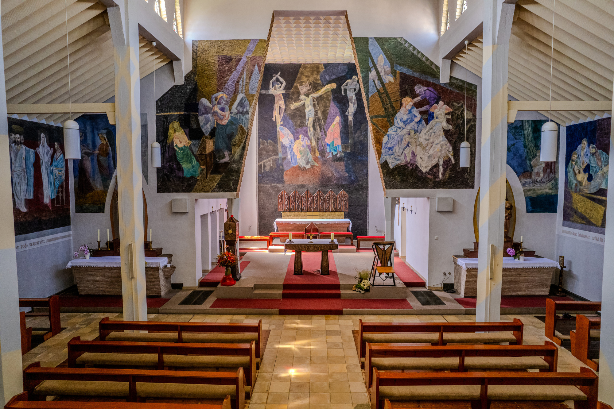 Vier Bilder zum Marienleben schieben sich wie eine Ikonostase zwischen Schiff und Chor und durchkreuzen somit die Leidensthematik der anderen Bilder.