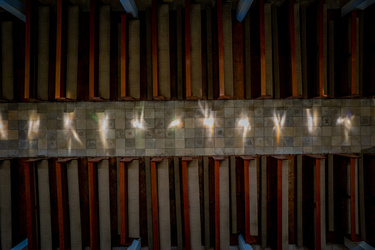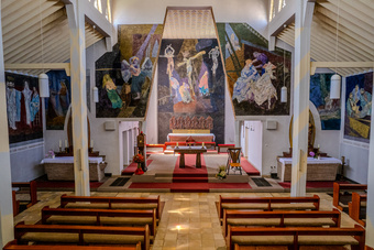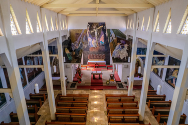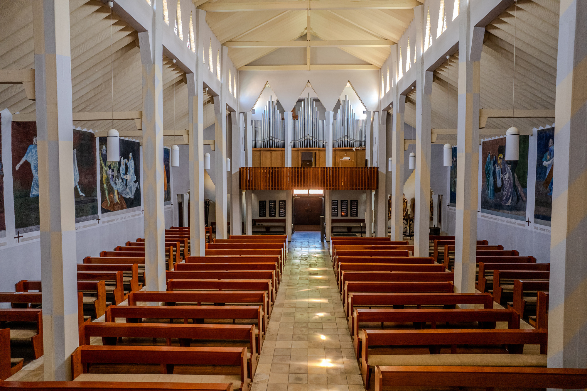 Die vierzehn Kreuzwegstationen (2,8 m hoch und bis zu 4 m breit) umschließen den Gemeinderaum von beiden Seiten und geben ihm zusätzliche Weite.
