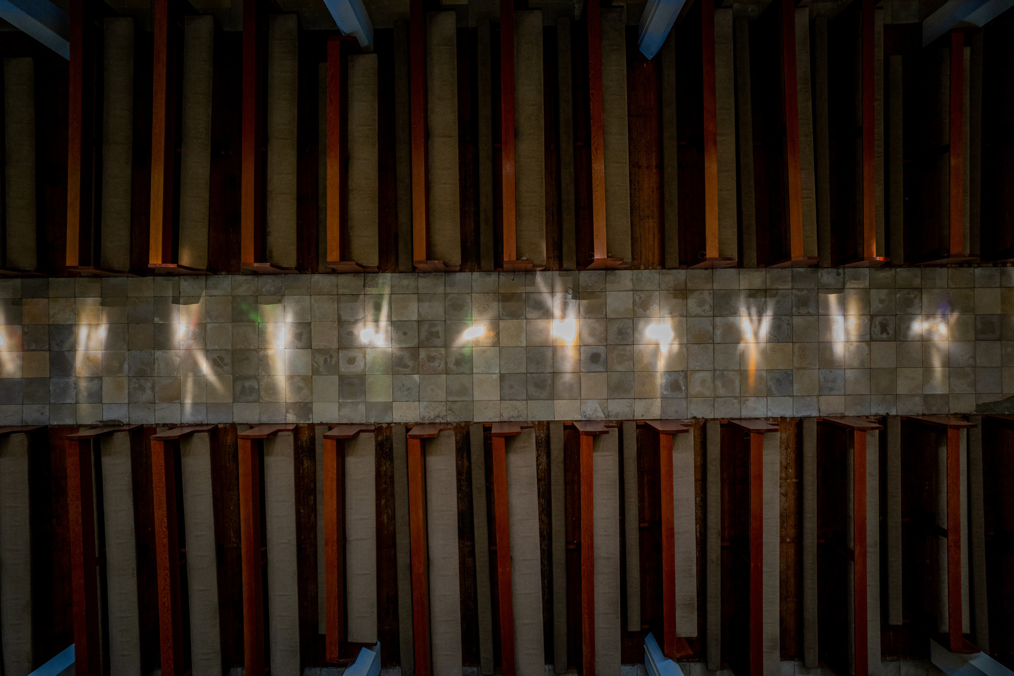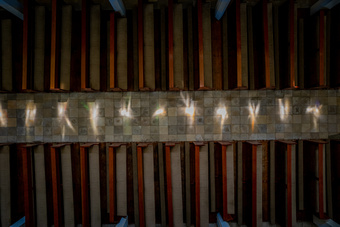 Die ursprüngliche Lichtführung ist ausgesprochen suggestiv. Der Eingangsbereich war einst vollständig dunkel, das Oberlicht der heutigen Eingangstür entstand erst 1988. Das Langhaus wird nur durch die dreieckige Fensterreihe im Obergaden belichtet. Im Altarraum übergießen zwei raumhohe Lanzettfenster den Altar und das Wandbild dahinter mit Licht.