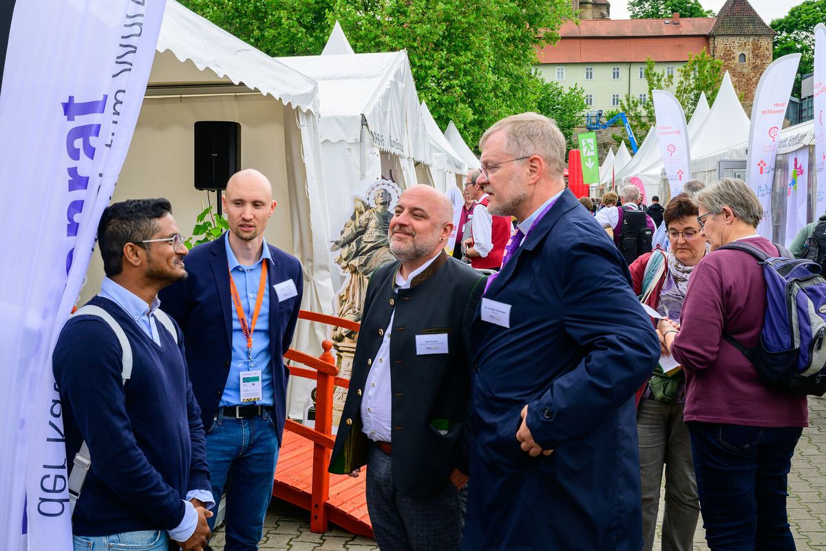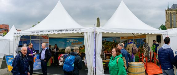 Würzburg (POW) Wie bunt und vielfältig die katholische Kirche im Bistum Würzburg ist, möchte die Bistumsbühne beim 104. Deutschen Katholikentag zeigen. Sie bietet von Donnerstag, 14. Mai, Christi Himmelfahrt, bis Samstag, 16. Mai, täglich am Oberen Markt in Würzburg ein abwechslungsreiches Programm. „Als gastgebendes Bistum haben wir unseren Stand in unmittelbarer Nachbarschaft zur Bistumsbühne – und das alles in der Innenstadt, während die anderen Bistümer auf der Kirchenmeile zu finden sind. Bei uns können die Besucherinnen und Besucher in geselliger Atmosphäre in den Austausch kommen, engagierte Ehrenamtliche genauso treffen wie Mitglieder der Bistumsleitung oder Protagonisten der Bistumsbühne“, sagt Florian Liebler, Verantwortlicher für Bistumsbühne und -stand.