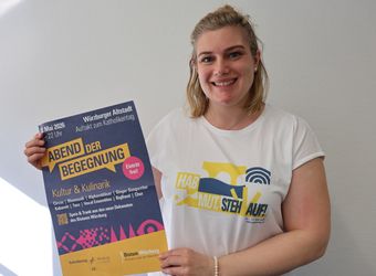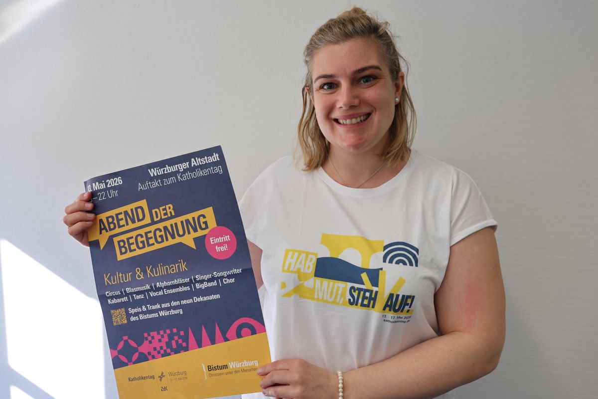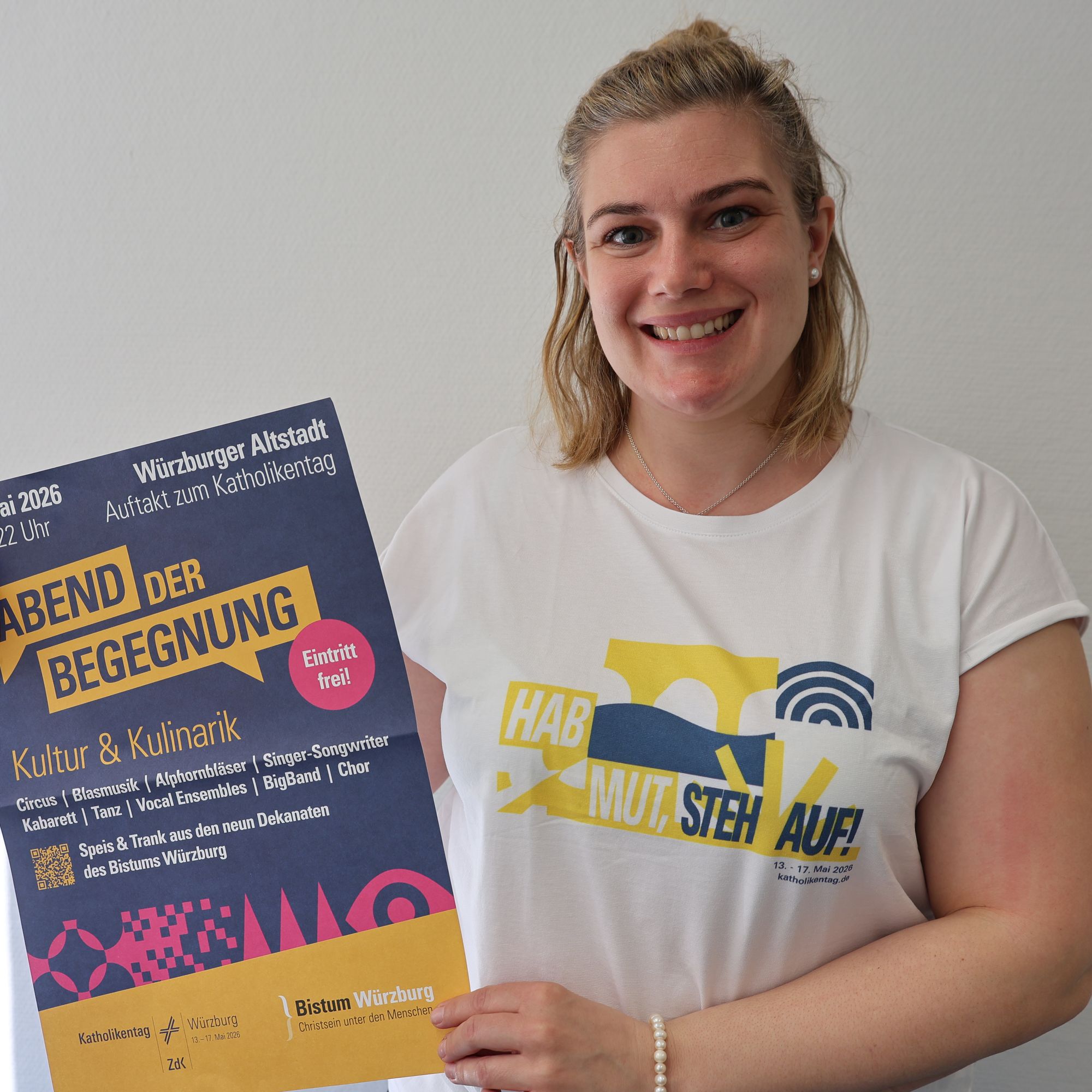Würzburg (POW) „So langsam wird spürbar, dass es nicht mehr lange hin ist bis zum Katholikentag“, sagt Elisabeth Schulz. Die 32-Jährige ist im Bistumsbüro der Diözese Würzburg Referentin für den „Abend der Begegnung“ bei der Großveranstaltung. Hinter dem Namen verbirgt sich die Veranstaltung des gastgebenden Bistums eines jeden Katholikentags, der traditionell direkt an die offizielle Eröffnung anschließt. „Es geht darum, die Besucherinnen und Besucher willkommen zu heißen und stimmungsvoll den Katholikentag einzuläuten. In Würzburg werden die neun Dekanate an neun Plätzen in der Altstadt Kultur und Kulinarik aus der jeweiligen Region bieten“, erklärt Schulz.