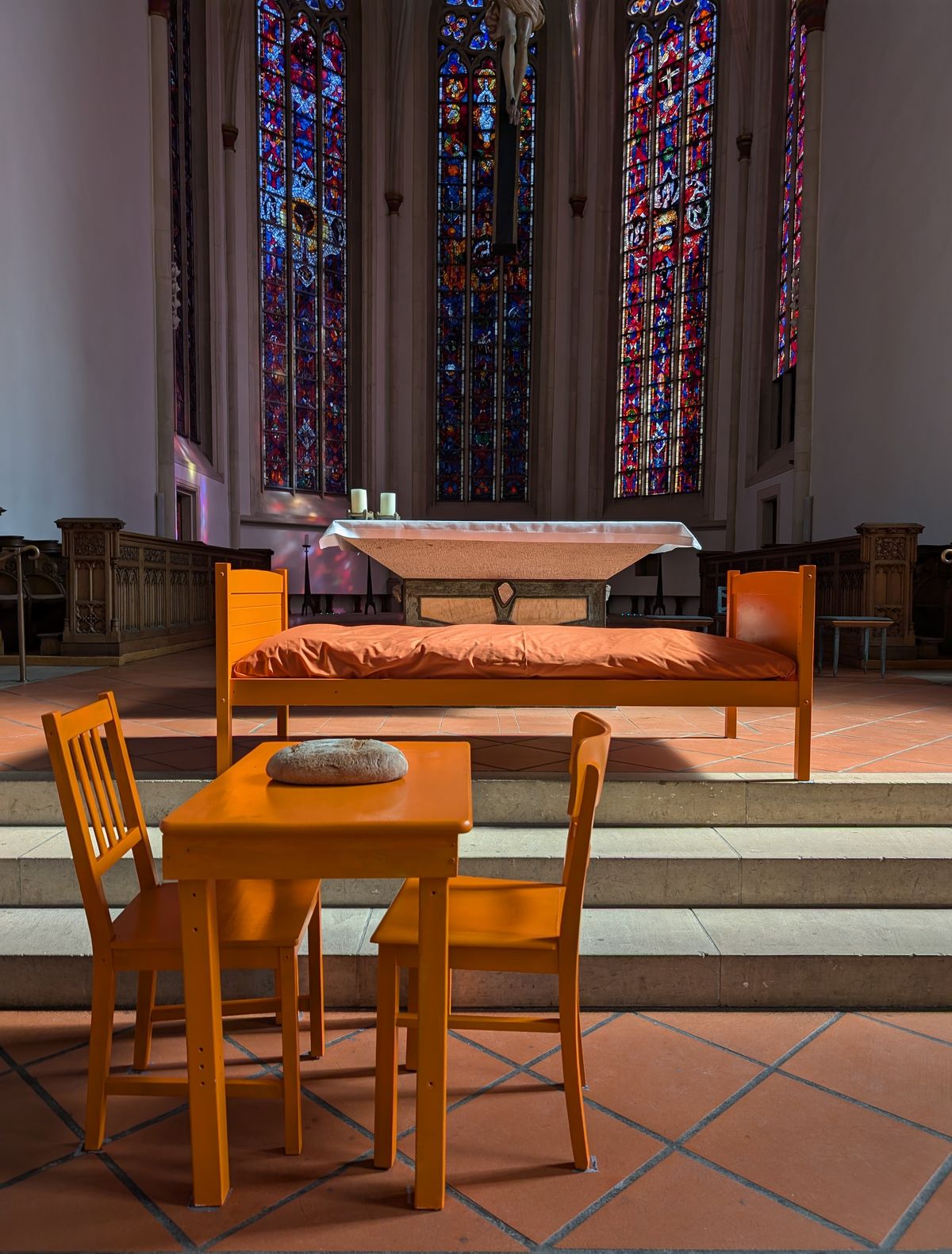 Zu sehen sind außerdem Porträts und Texte von Geflüchteten, die im Kirchenasyl Schutz gefunden haben. Die Ausstellung des ökumenischen Netzwerks „Asyl in der Kirche in NRW“ aus Münster erzählt von ihren Erfahrungen und Perspektiven. Ergänzende Roll-ups informieren über die Praxis und die Herausforderungen des Kirchenasyls. Eine symbolische Installation mit Bett, Tisch, Stuhl und Schwimmweste verweist auf die Entrechtung und Objektivierung der Geflüchteten, die Gefahren der Flucht und den notwendigen Schutz ihrer Würde als Subjekte des eigenen Handelns.