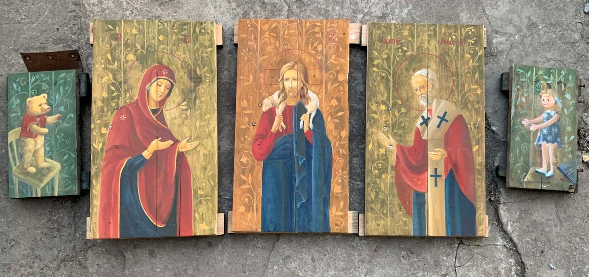 Eine weitere Ausstellung zeigt Ikonen, welche die ukrainischen Kunstschaffenden Oleksandr Klymenko und Sonia Atlantova auf gebrauchten Munitionskisten gestaltet haben. Die Bilder reflektieren „das Spannungsfeld zwischen den leidvollen Erfahrungen des Kriegs und den Überstieg des Leids im Glauben“. Sie eröffnen Gespräche über das Dilemma zwischen Aufrüstung, „gerechtem“ Frieden und dem menschlichen Leid, besonders im Kindheitszyklus über entführte Kinder. Klymenko und Atlantova bieten Begegnungen und Gespräche an, unterstützt durch begleitendes Informationsmaterial.